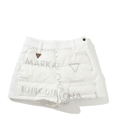 Culottes-like shorts that expand toward the hem (left side opening). To prevent the waist and hips from looking too big with the bulge of the down pants, the volume has been moderately suppressed by switching to a highly stretchy material. The front and back pant sections are made of PU-finished nylon material. It is characterized by its wet-like luster and lightness. The sides and belt portion are made of soft and skin-friendly nylon fiber, knitted in a high gauge scuba knit structure. It features a classy surface texture while bringing out the best of the jersey material in all its glory.