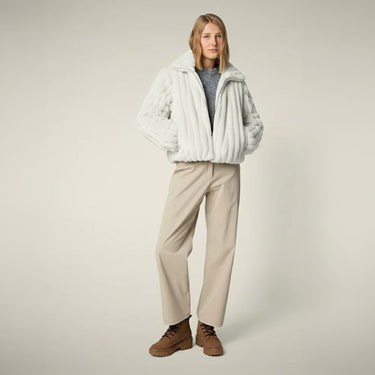 The “Elina” fleece jacket combines timeless design with modern details, featuring a slightly cropped straight cut, softly defined shoulders, voluminous elastic-cuff sleeves, vertical quilted texture, and practical elements like a zip closure, high stand-up collar, and deep side pockets—all crafted from lightweight plush fleece in line with Save The Duck’s eco-friendly, animal-free philosophy.