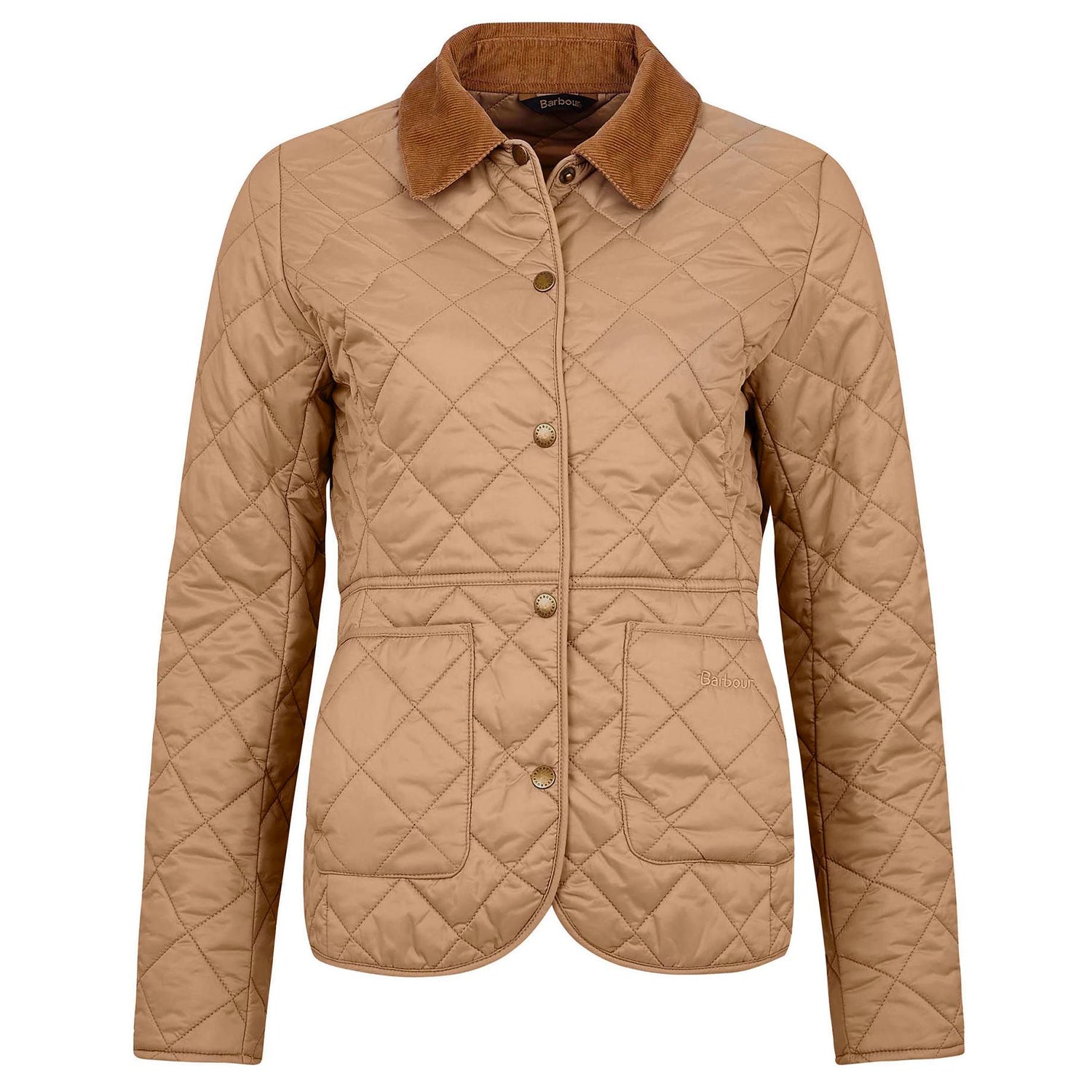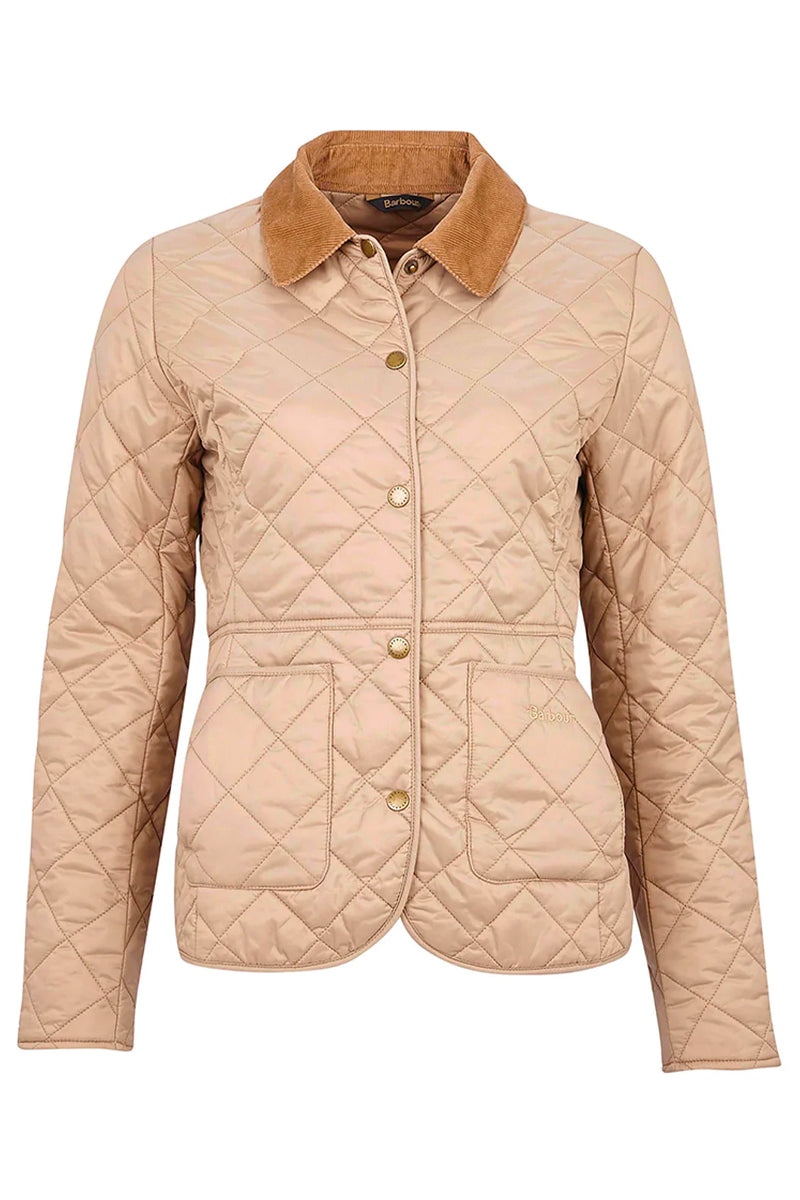The Barbour Deveron jacket is box quilted with a corduroy collar and a feminine contrast lining. It features two practical patch pockets to the front and embroidered Barbour branding for an authentic touch.