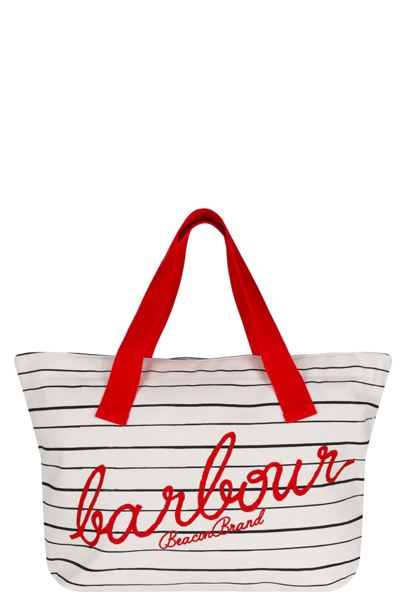 The Barbour Littlehaven Tote Bag is a nautical-inspired design made in hardy cotton canvas with a printed stripe and bold Barbour branding. Ideal for carrying summer essentials, this versatile accessory features a zip closure, cotton webbing handles and an internal pocket.
