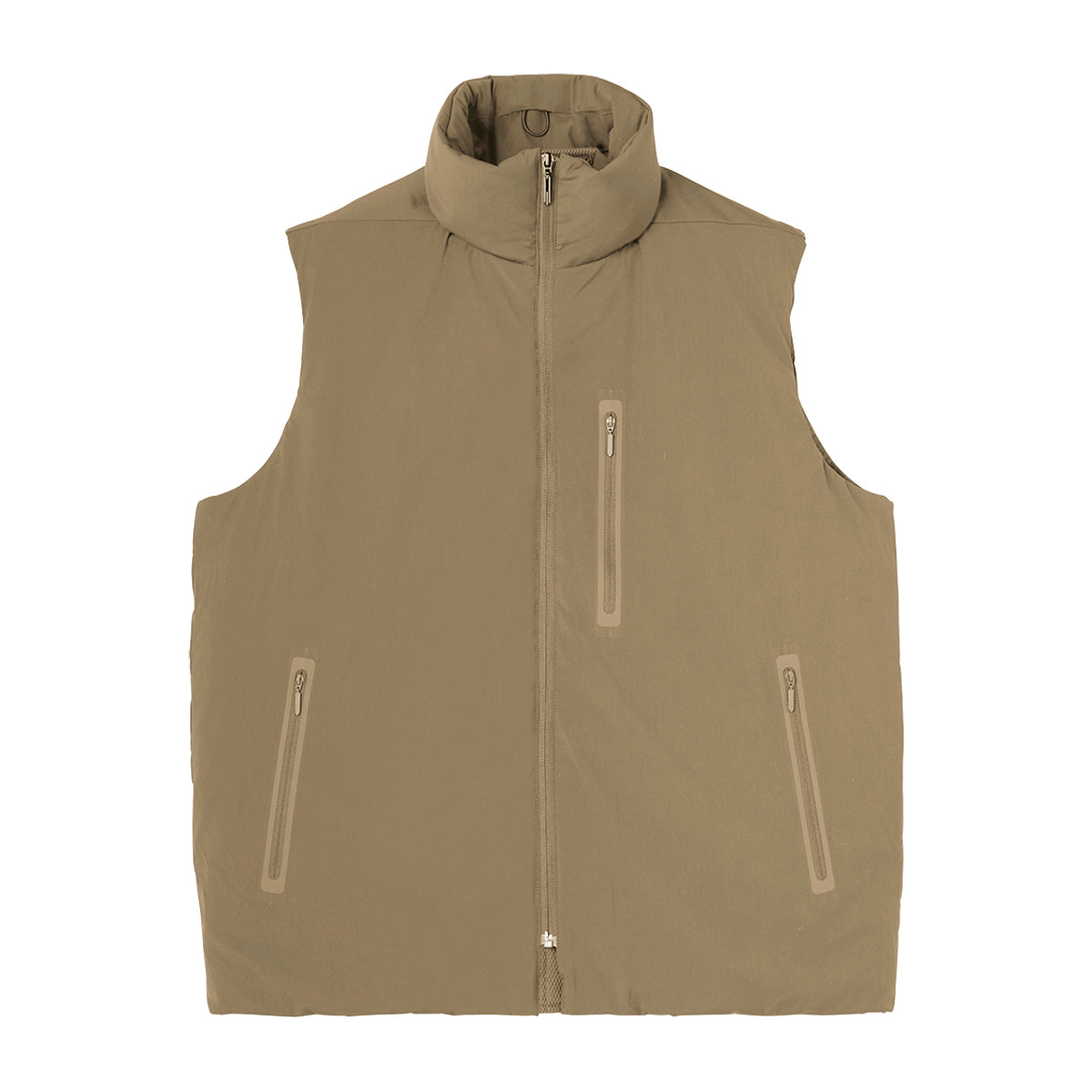 A Down Vest developed, on a sleeping bag principle, for heat retention and wearing comfort. Its H.C.S (Heat Circulation Structure) has a Twin Dome※1 and Air-Through※2 construction to eliminate cold spots and retain heat inside. The outer fabric is a combination of wool and recycled polyester with stretch and a natural touch. The lining is DESCENTE's proprietary HEAT NAVI®, which converts light into heat and provides active heat retention. Highly versatile as outerwear or as a layering piece.