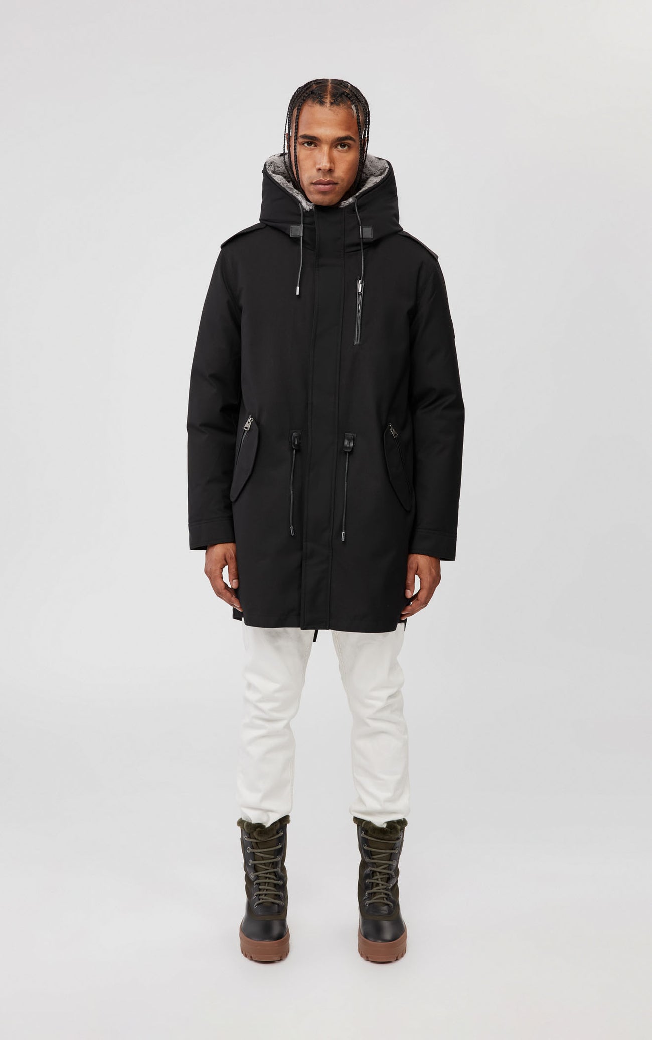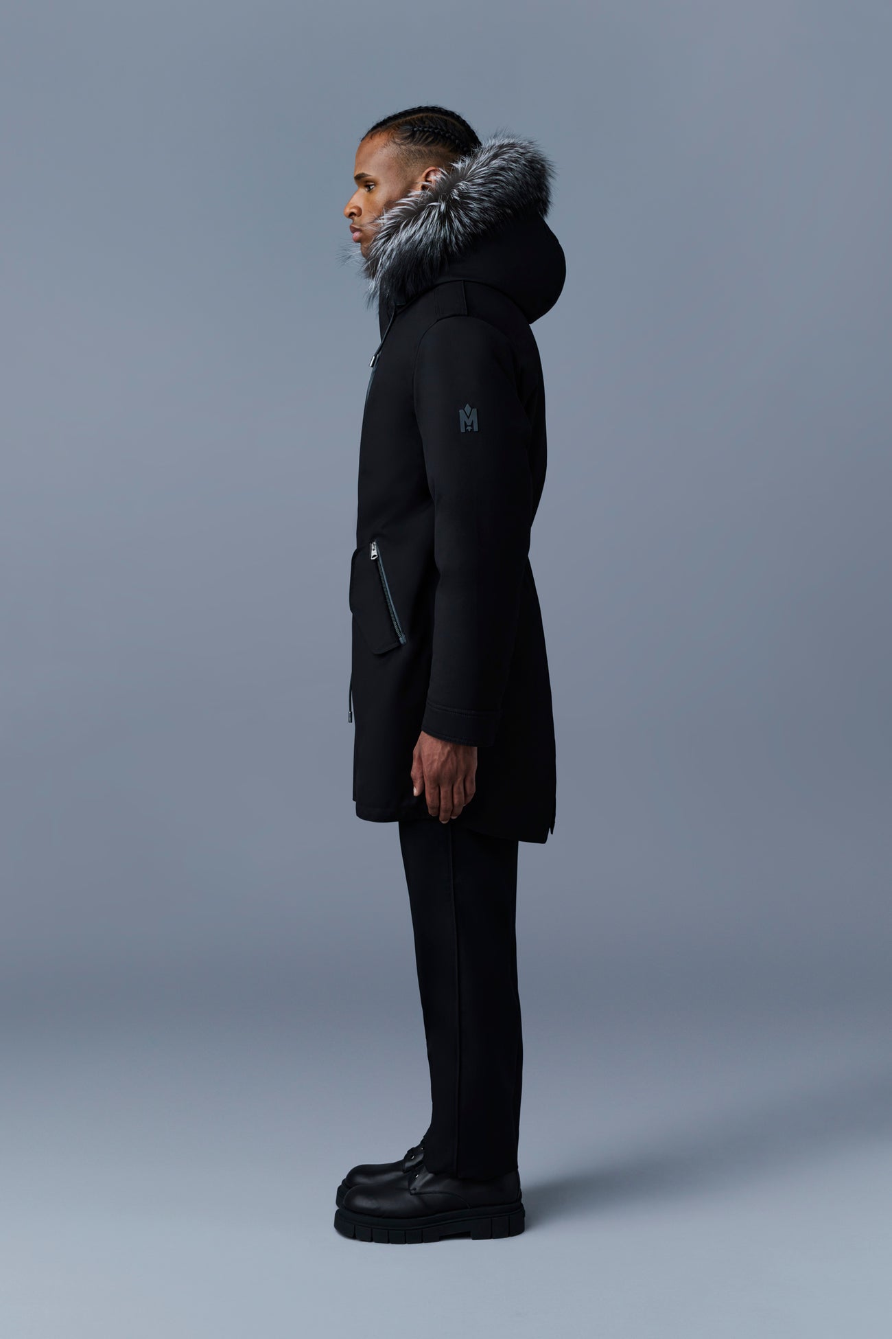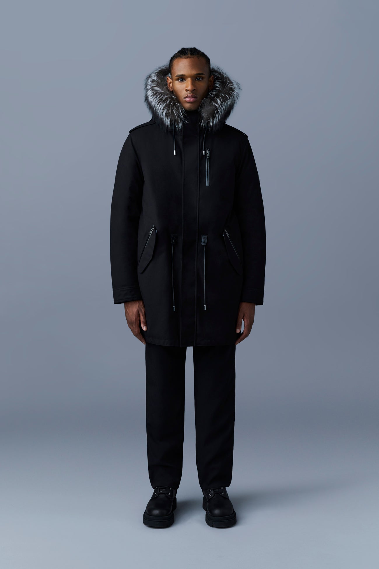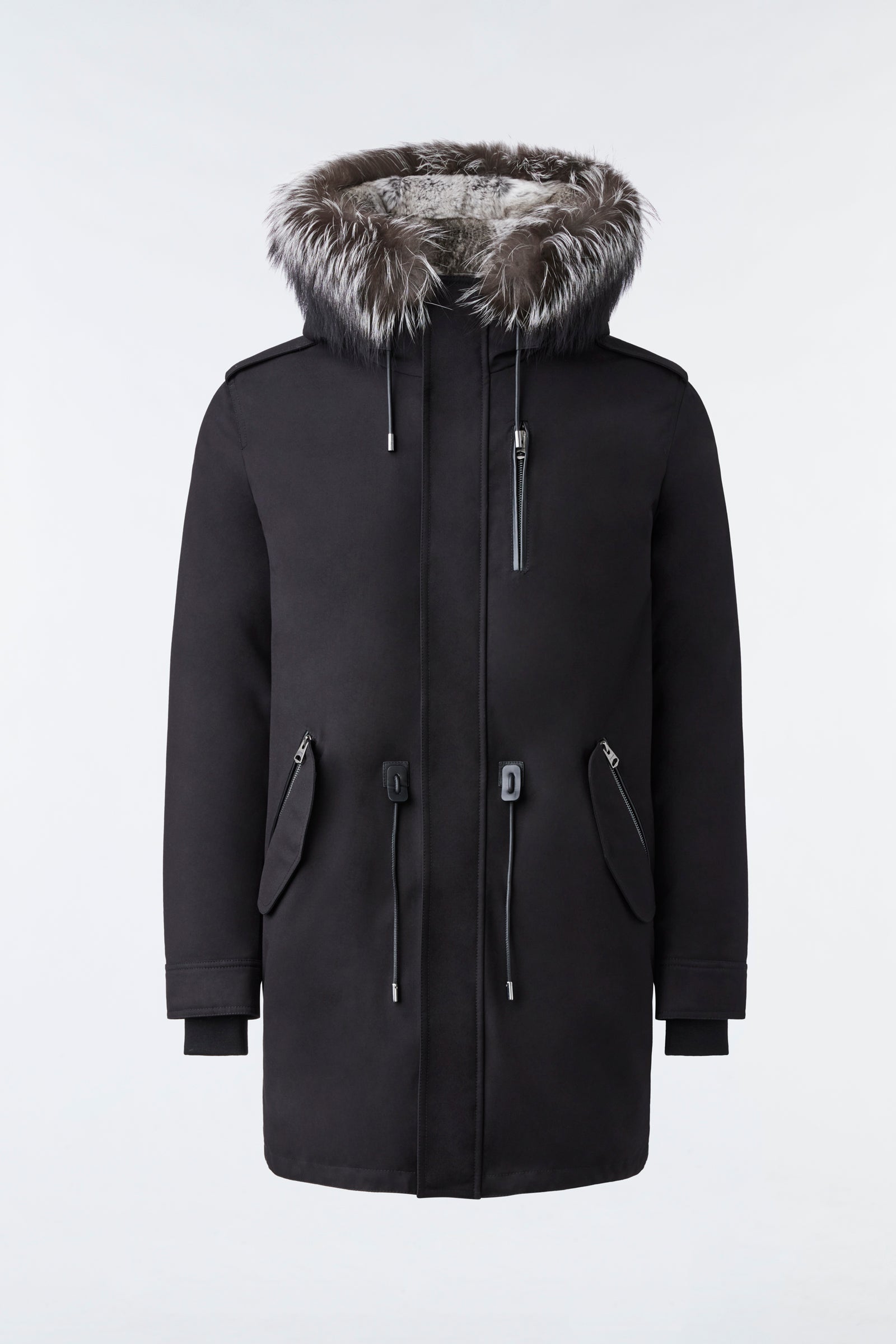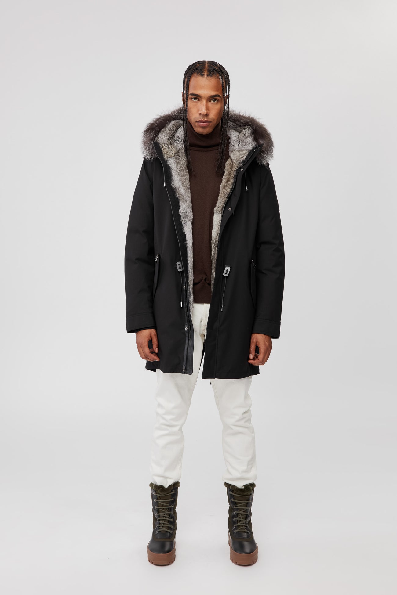 MORITZ is a twill parka with a removable silver fox fur trim around the hood. Water resistant, repellent, and windproof, it features a body and hood lined with luxurious rabbit fur. Storm cuffs, down-lined sleeves and (R) Leather drawcords at the waist improve heat retention. Plush construction meets high-performance in this elevated winter essentail engineered for superior protection.
