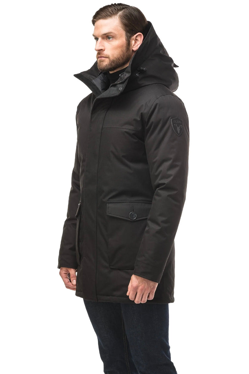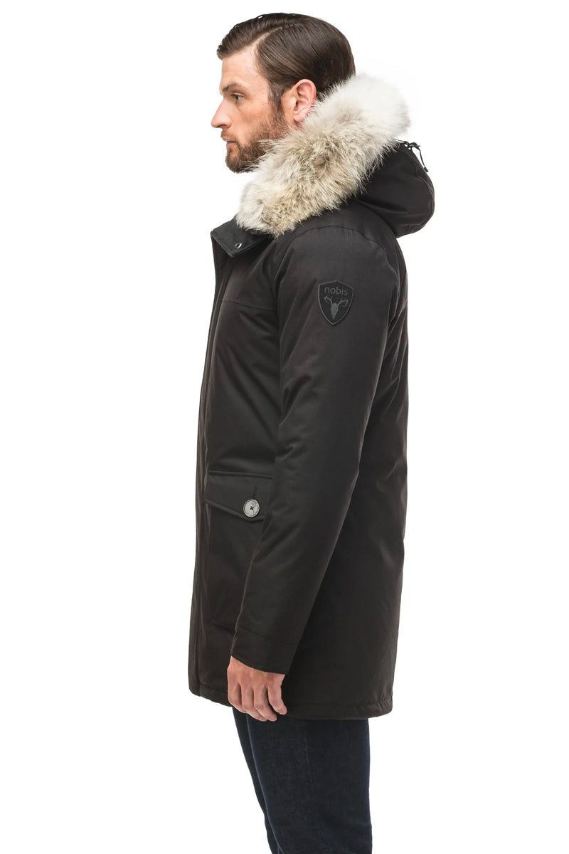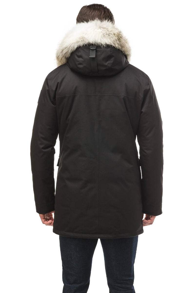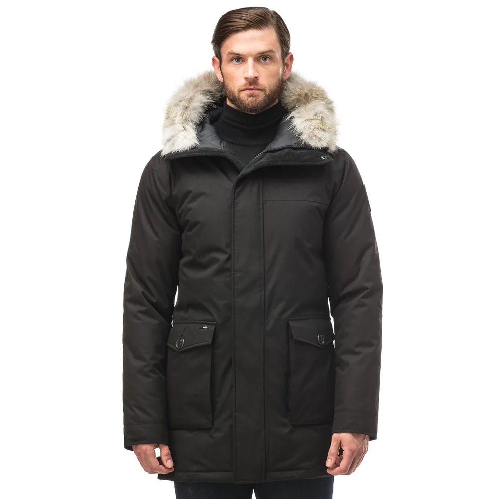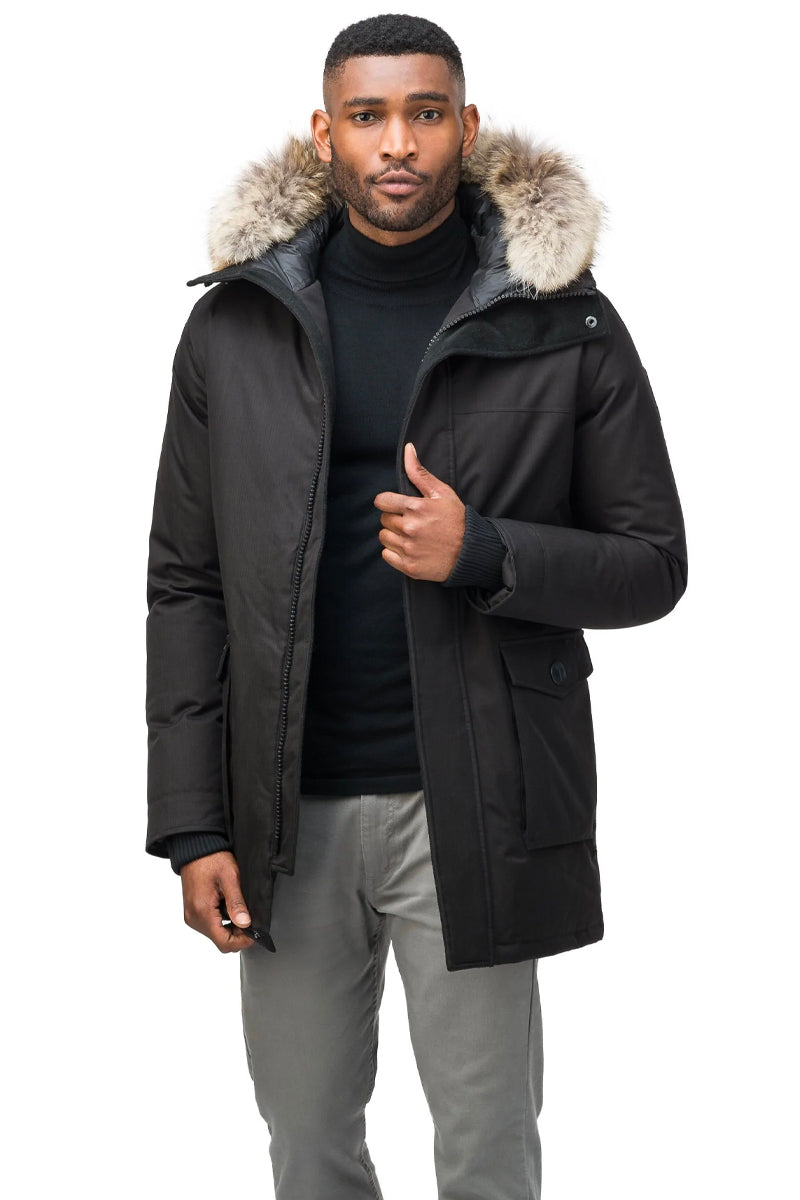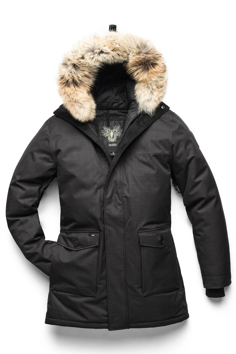 - Non-removable down filled hood with moldable framing wire and removable coyote fur ruff