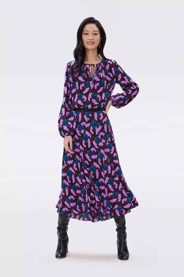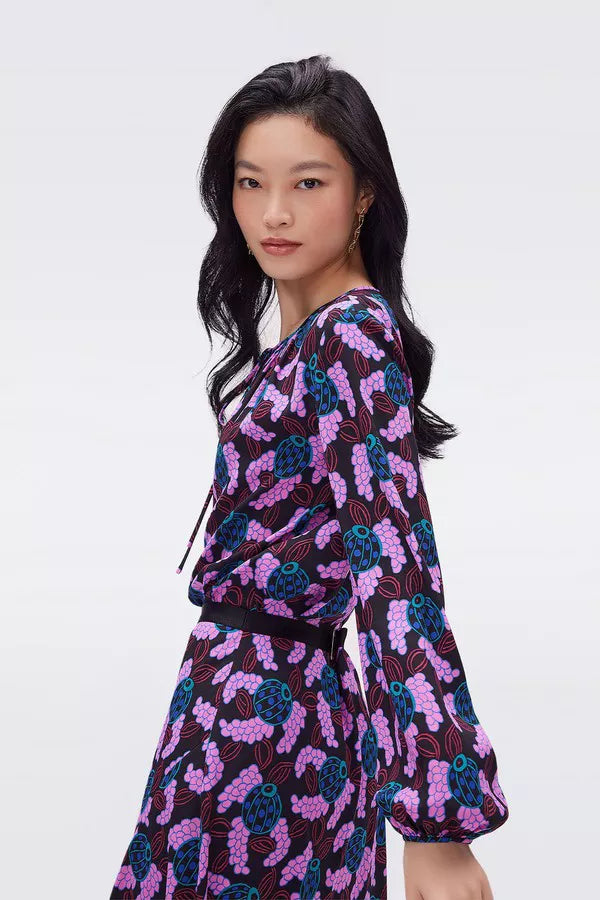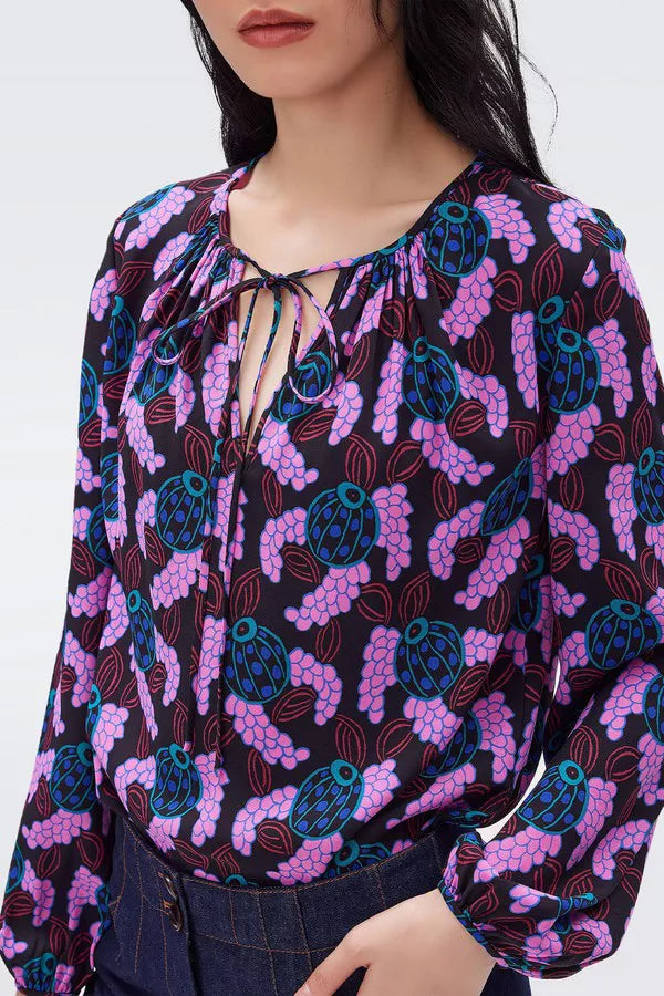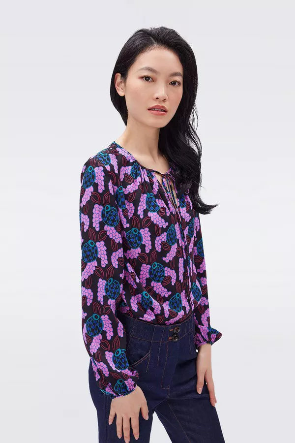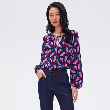 Our take on the peasant blouse, the Freddie is cut from a lightweight crepe. This piece has a relaxed, easy shape, long billowy sleeves, and neck tie detail.