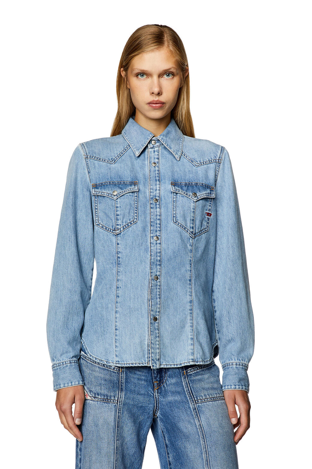 Designed with Western-inspired details, this woman's denim shirt features a straight cut and metal snap buttons. Made from fix denim with partially recycled cotton. The light blue wash channels a subtle lived-in look.