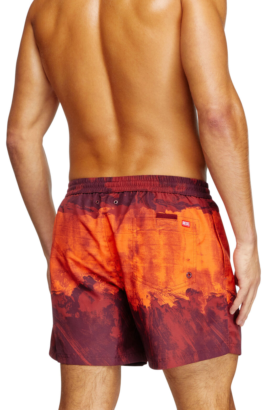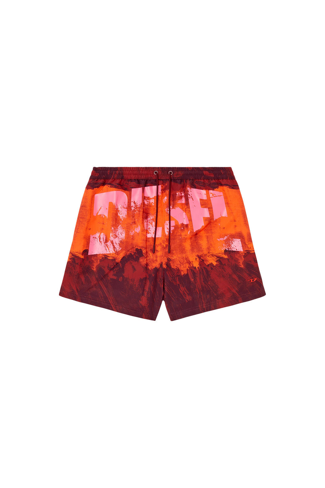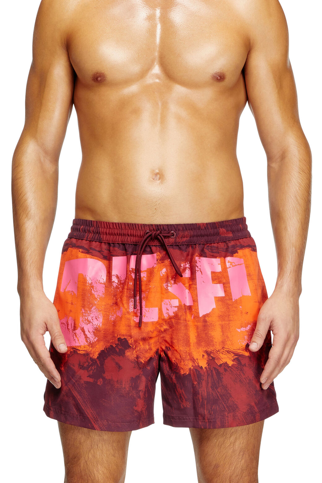 Men's mid length swim shorts in fast-drying recycled fabric, featuring an elasticated drawstring waist and a trio of pockets. The fun graphic print brings on a smudgy disruption of colour, complemented by the fragmented Diesel logo on the front.