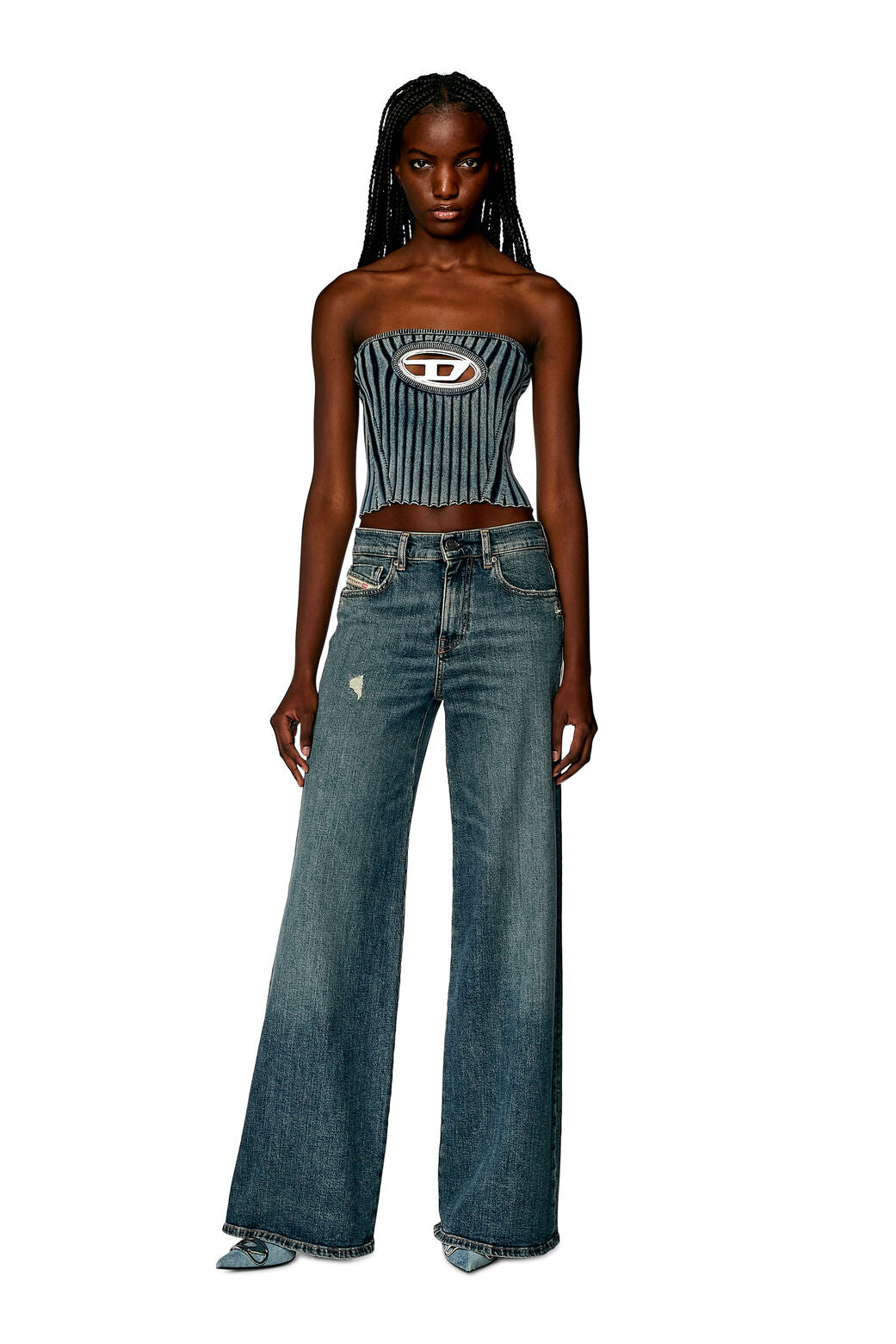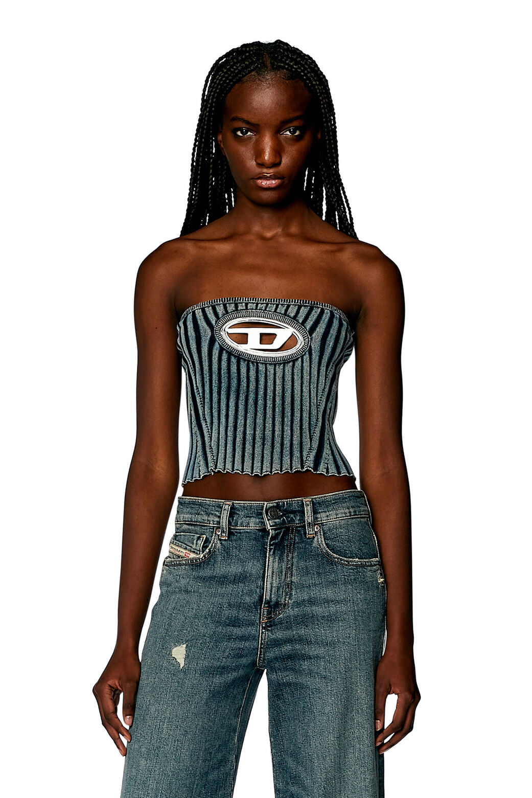 Slim-fit blended cotton bouclé bandeau top plated with Lycra for a compact feel. A stonewashed finish imparts a worn-in look, whilst an enamelled metal 'D' plaque on the chest creates a peek-a-boo effect.
