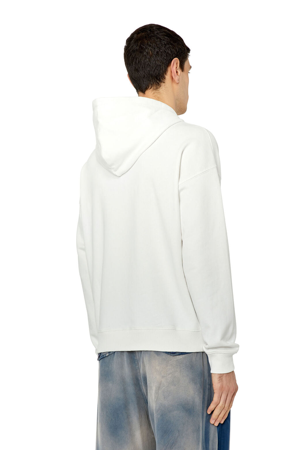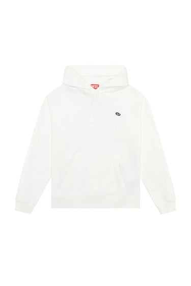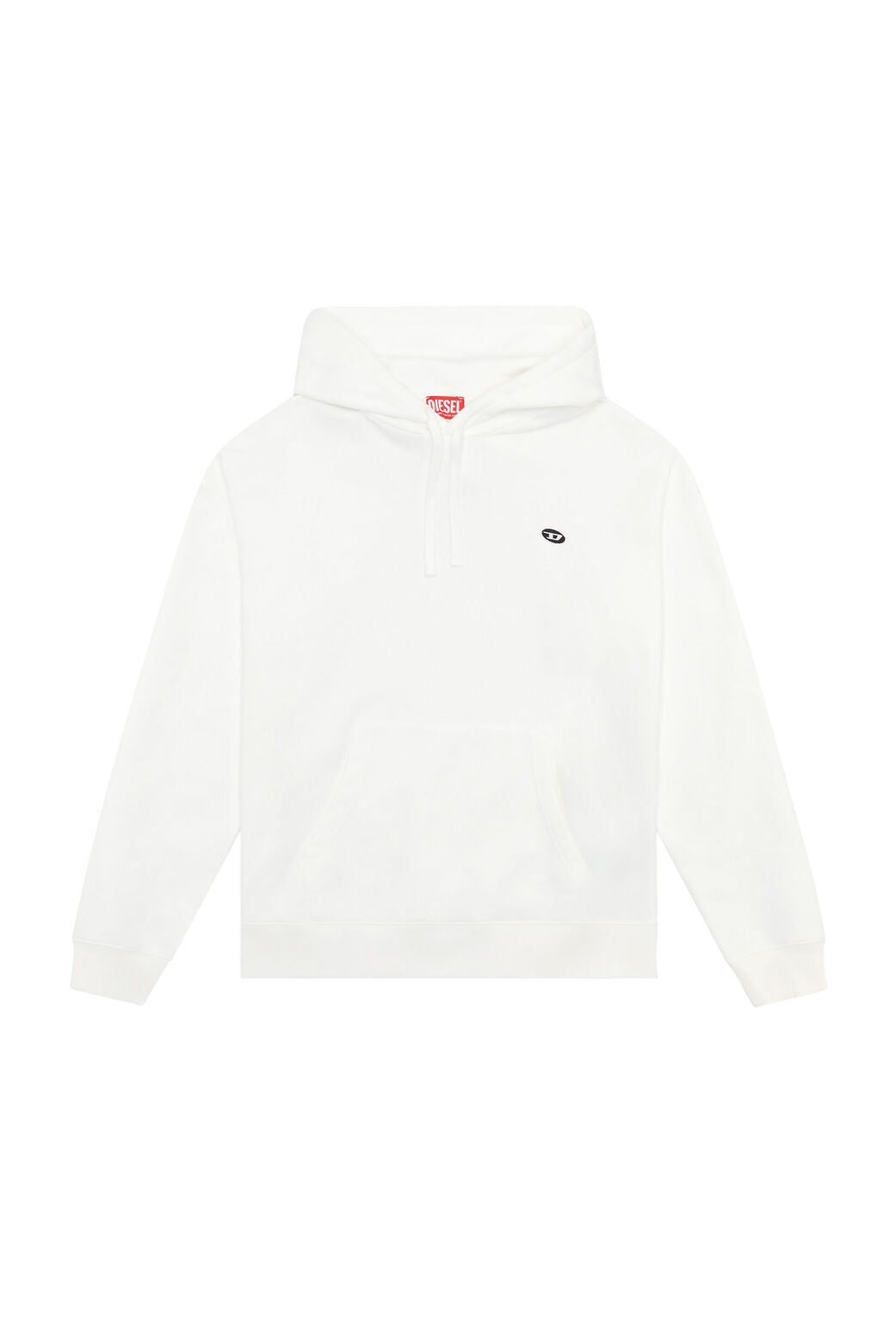 Men's organic cotton sweatshirt, flaunting a regular fit with dropped shoulders. Topped with a drawstring hood, it features an oval 'D' patch on the chest.