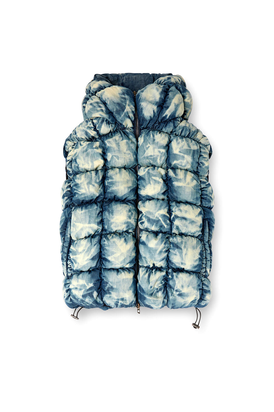 This unisex winter vest showcases Diesel's experimental aesthetic and denim expertise. Crafted from lightweight slub denim with a water-repellent finish, it features a tie-dye design that enhances its unique, three-dimensional puffy appearance. The vest is insulated with padding and quilted in squares for added warmth.