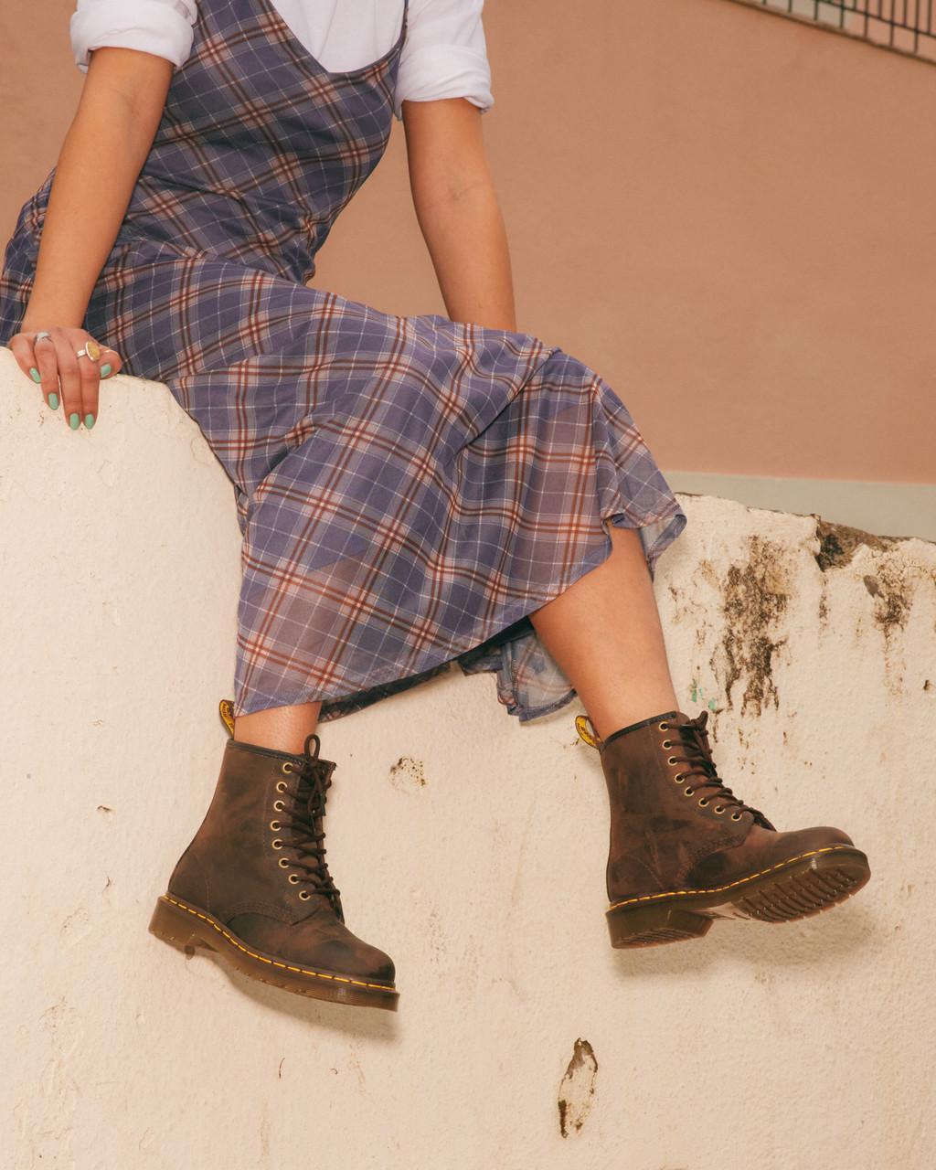 A new leather for an old classic: this iconic 8-eye 1460 boot is made with Crazy Horse, a solid leather with a worn, distressed look.
