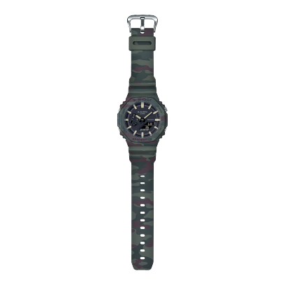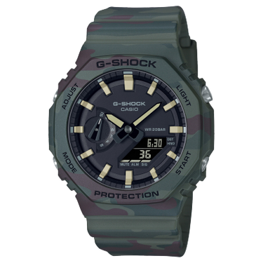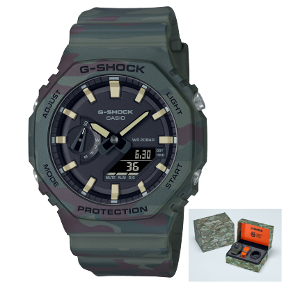 From the toughness-driven G-SHOCK, a design inspired by adventurers whose love of the wilderness knows no bounds. Switch between interchangeable bands and bezels for a thin octagonal GAE-2100 with an even wilder spirit. Green nature-inspired camouflage and vibrant outdoor-fashion orange take you from fashionable urban streets to wilderness exploration in cool, casual style.