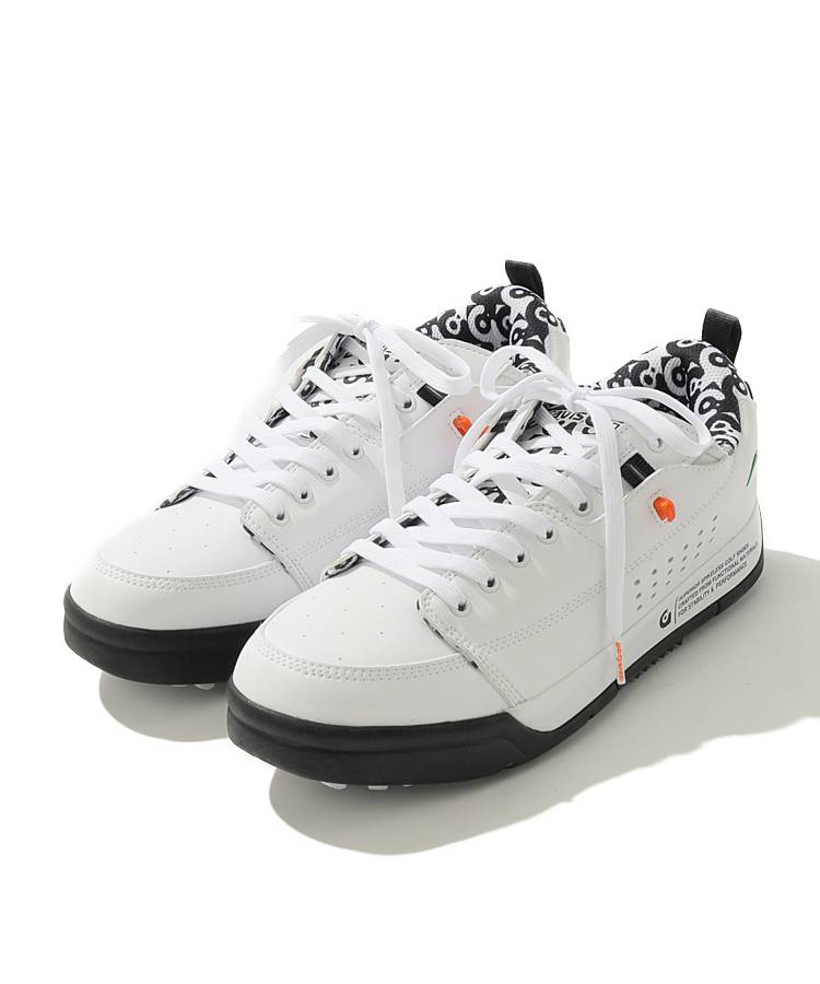 Introducing the second iteration of the "gravis golf Tarmac" model, designed to accommodate various sports scenes. These golf shoes feature the original "gravis checker" pattern fabric used in the lining and midsole to add accents. The upper is crafted from easy-to-maintain synthetic leather with a textured finish. They are designed for easy on/off with the "EASY ON / OFF" feature and incorporate orange "Shoe Lace Hooks" that allow for secure lacing.