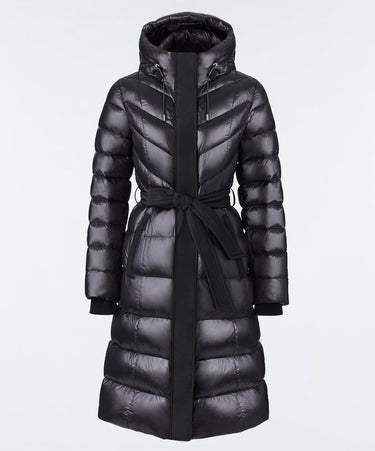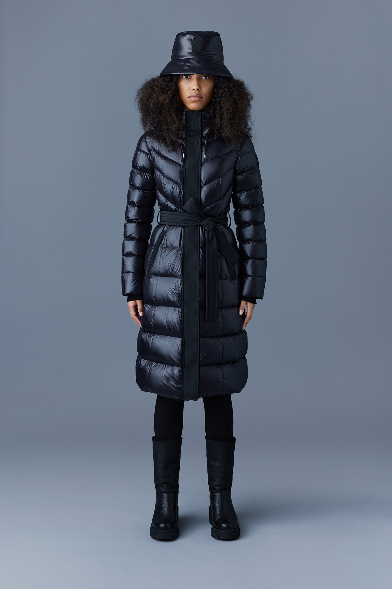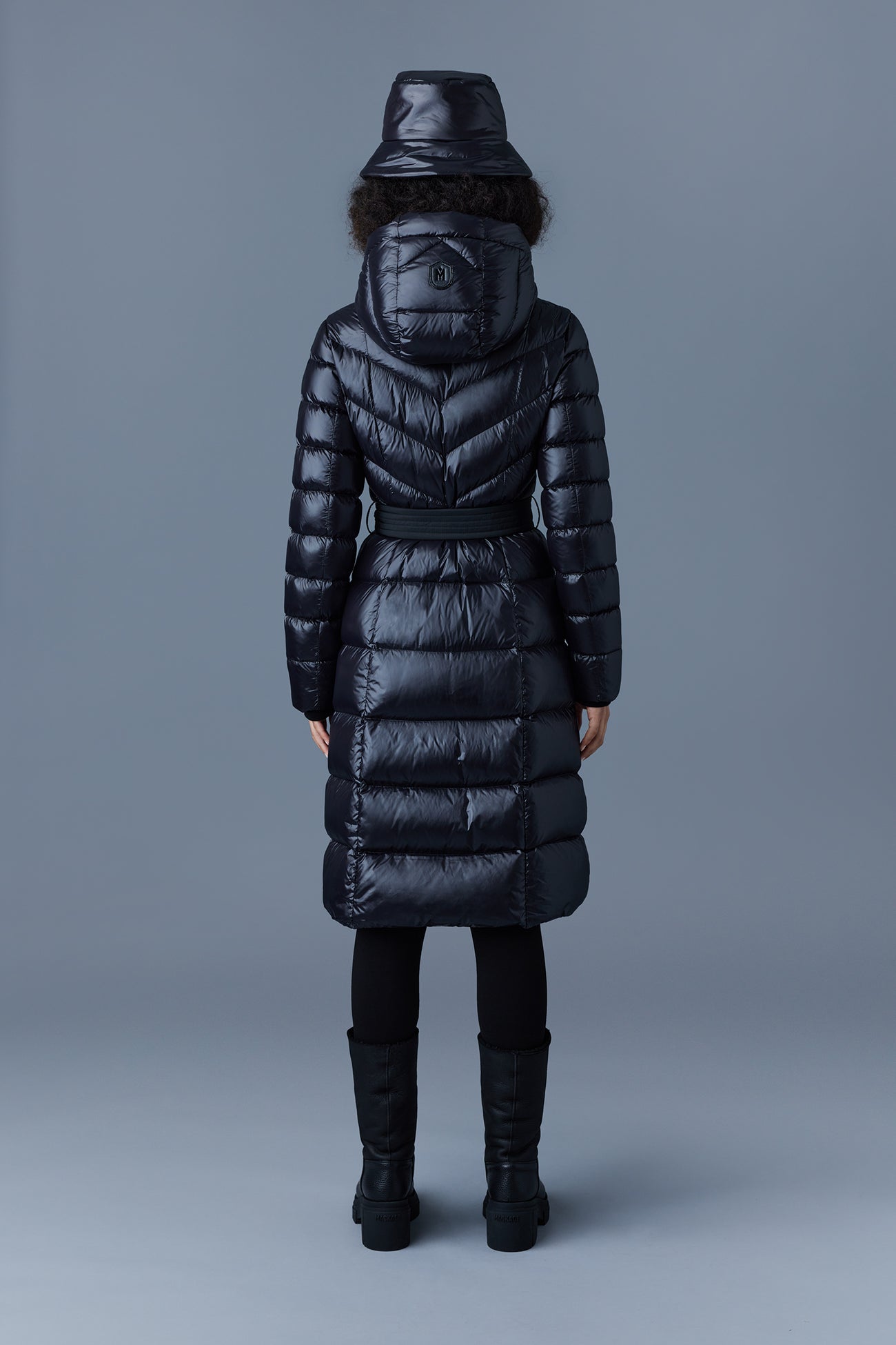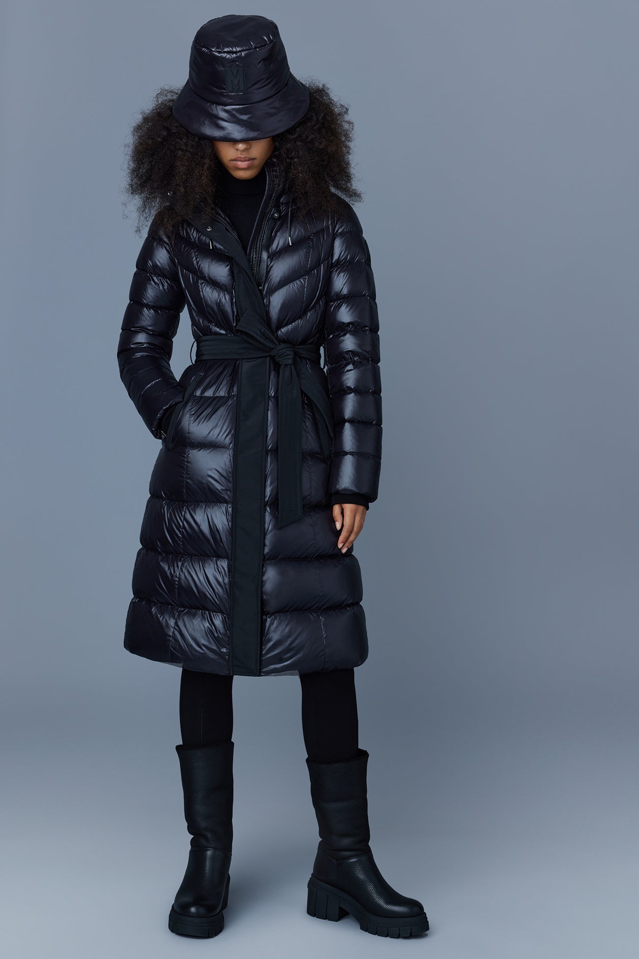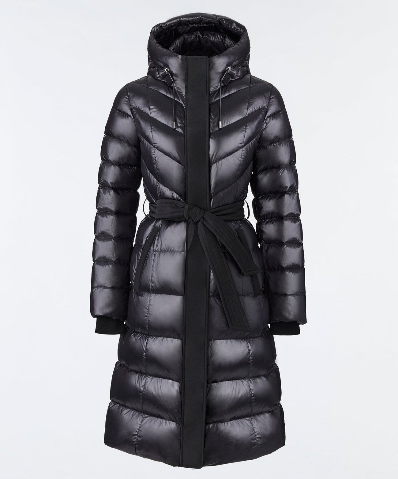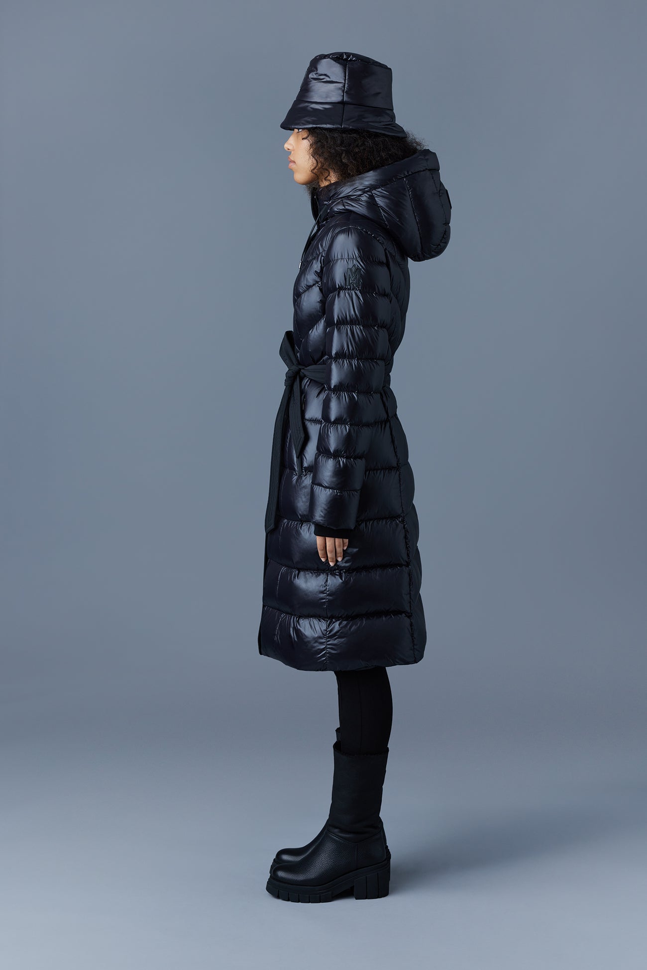 CORALIA is a weightless recycled down coat for women with a hood, and sash belt closure for customizable comfort. Machine washable and water resistant and repellent, storm cuffs and a drawcord-adjustable storm visor with a pillow collar deliver weathergrade protection. Safely store essentials with an inside pocket and welt pockets. Engineered with technical comfort for superior warmth, a modern icon to elevate any winter outfit.