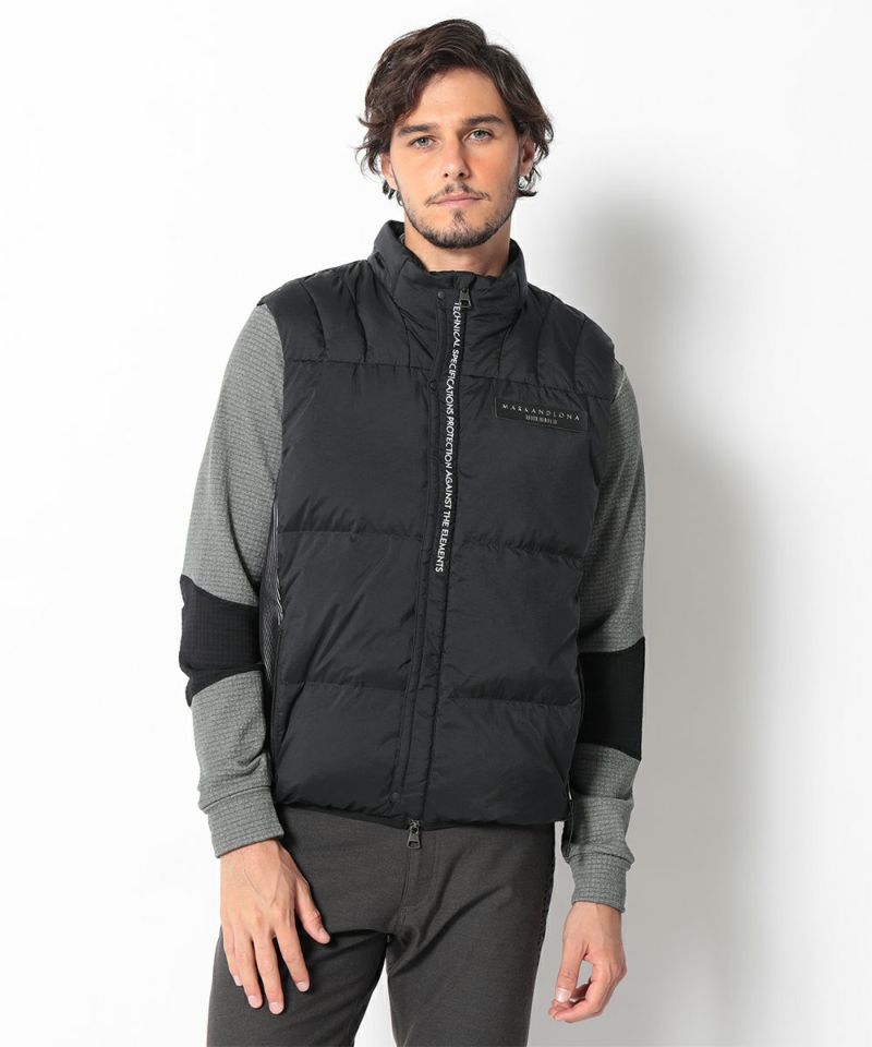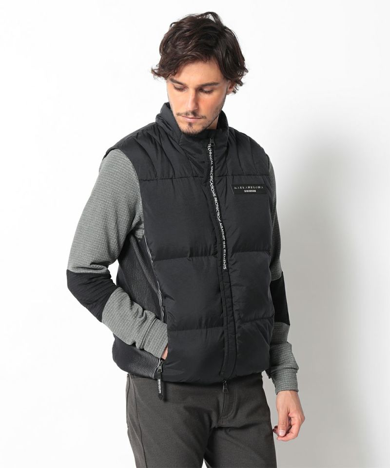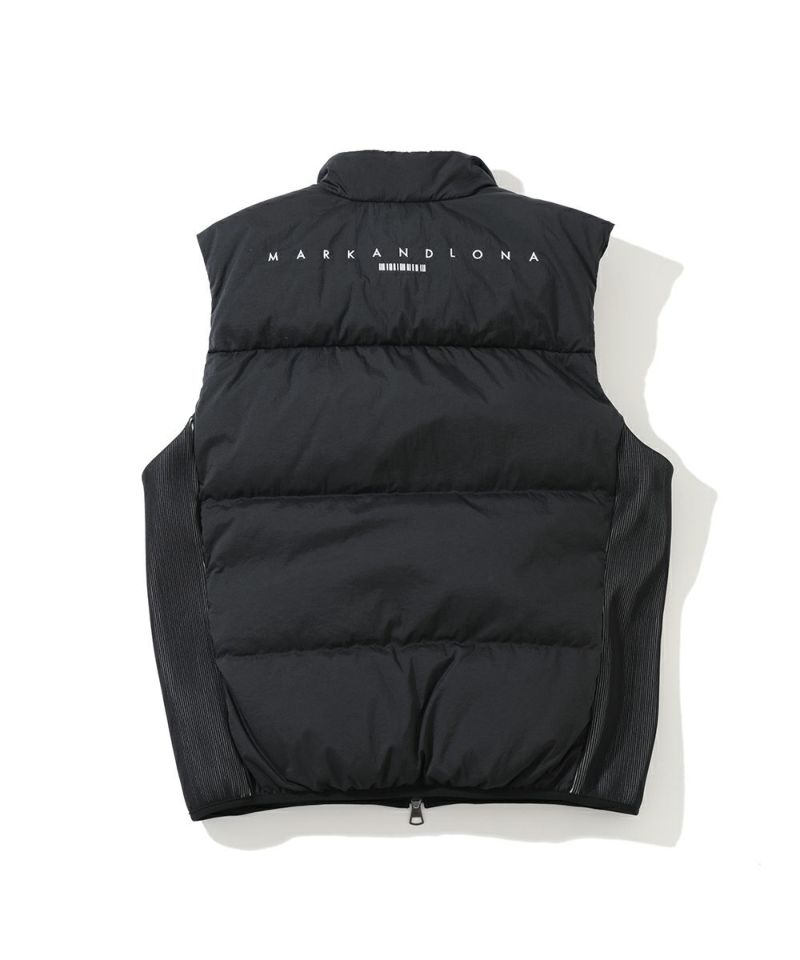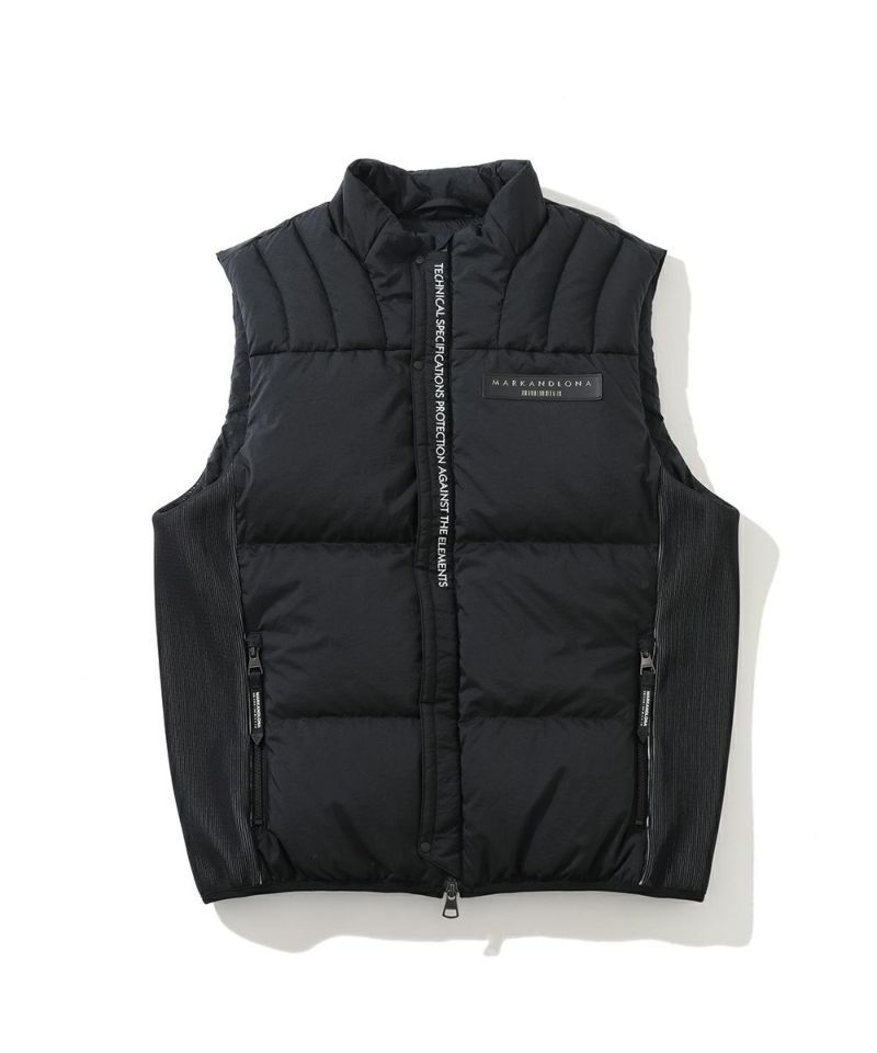 Nylon taffeta material with a unique deep color expressed by weaving in black primary yarn. The weaving of hollow nylon threads makes the material lighter, and it also has excellent heat retention properties as it holds in air. It has a moderate stretchiness and knitted ribs on the sides to accentuate the design. When the ribbing is expanded, the color scheme peeks out.