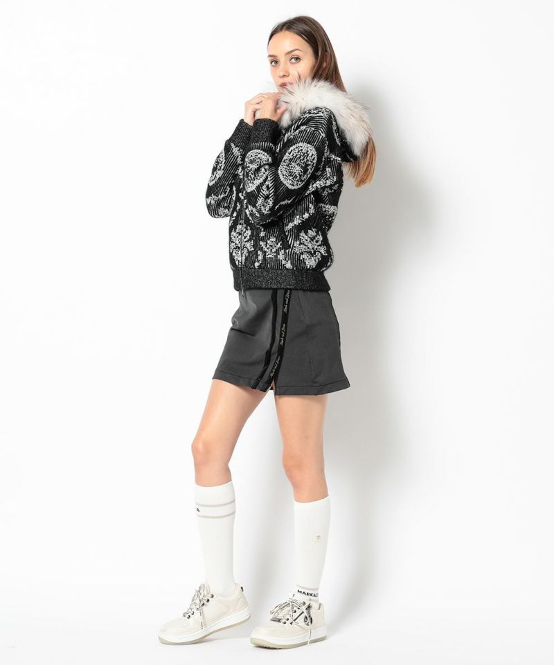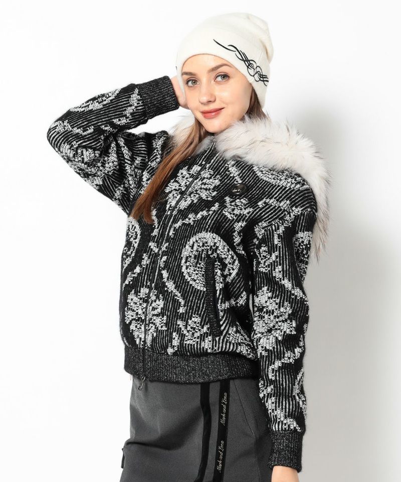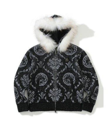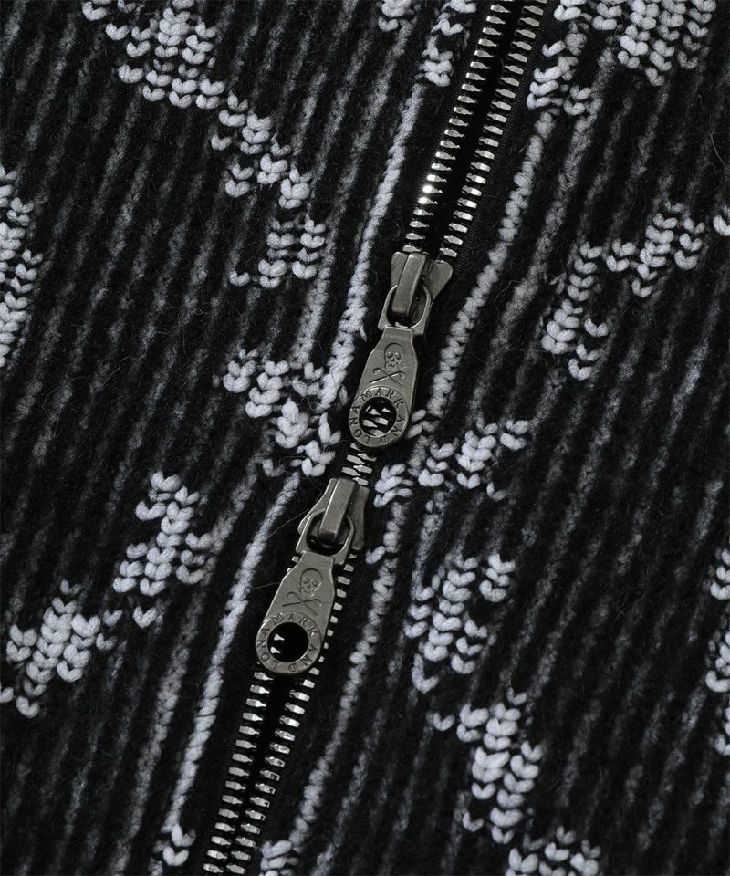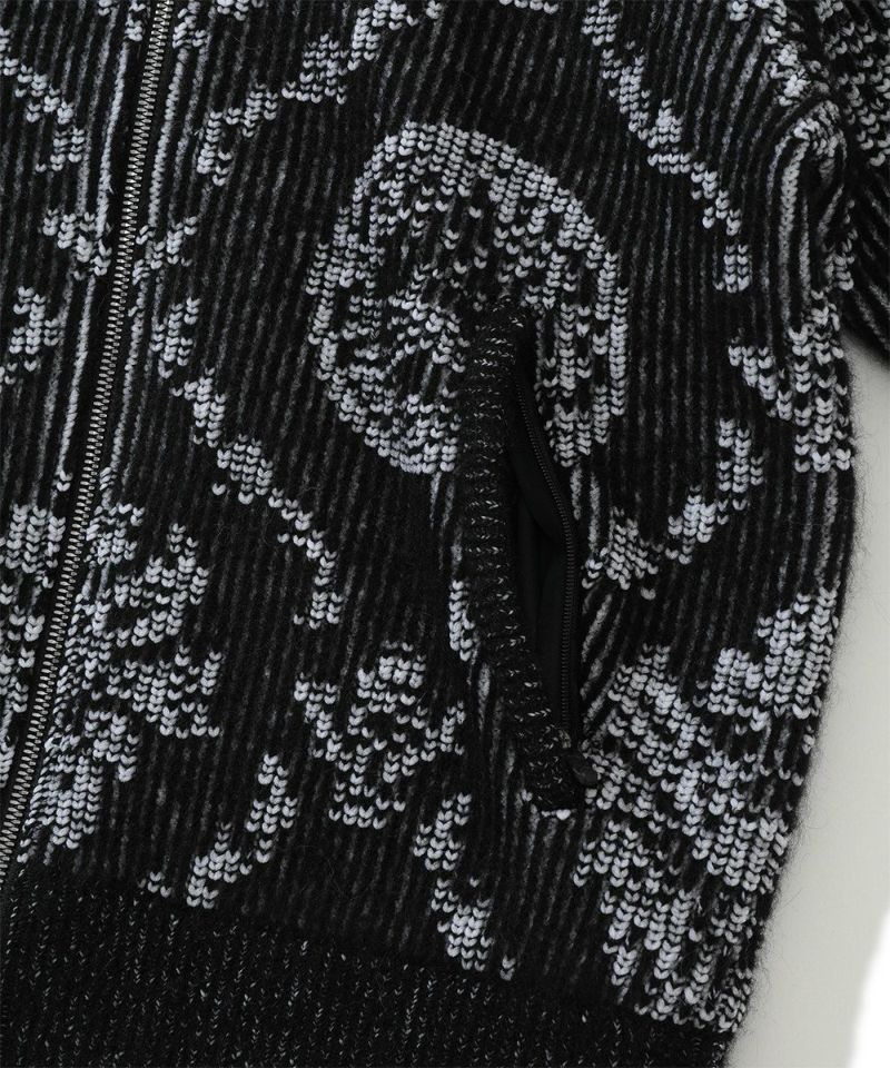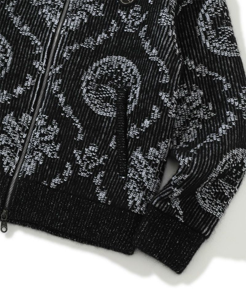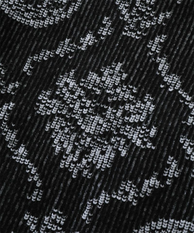 Made of a mohair blend popular for its fur length. Generally, mohair-blend materials tend to be thin, light, and somewhat unreliable, but this material contains nylon and spandex, so the knitted fabric itself is firm and bulky. It is also stretchable, allowing the knit to follow the body's movements while being worn. This material combines the shaggy, catchy look characteristic of mohair blends with practical comfort. Jacquard knit of such a good yarn and a high-count polyester yarn characterized by its flexibility and powdery touch. This technical knitted fabric expresses a damask pattern in three dimensions.