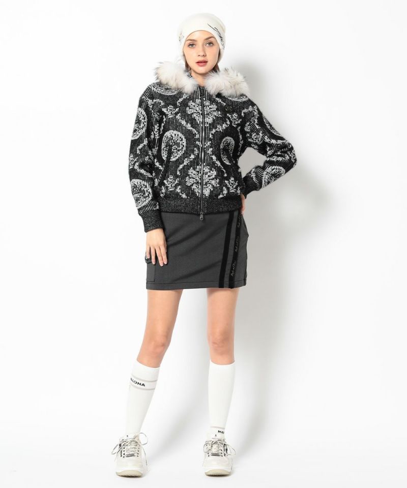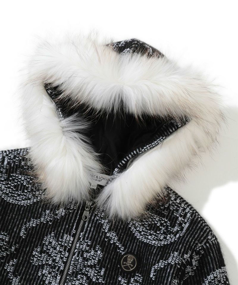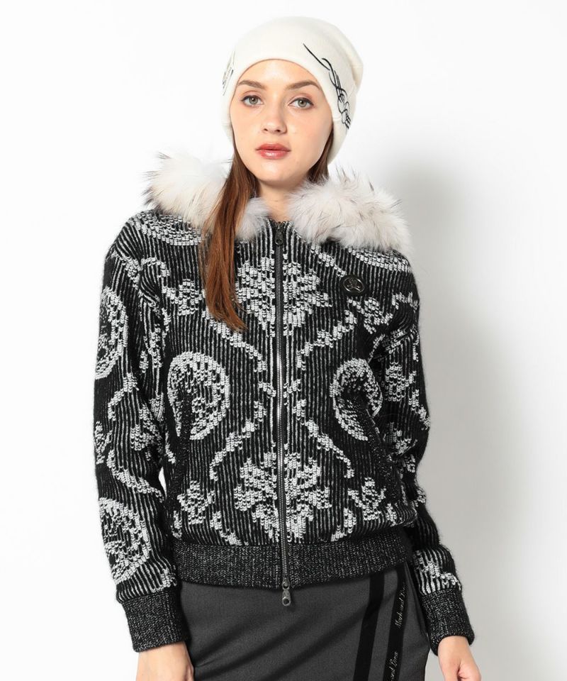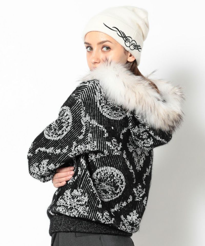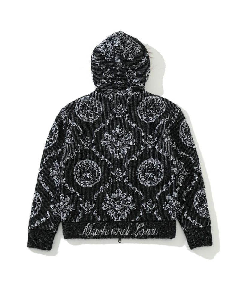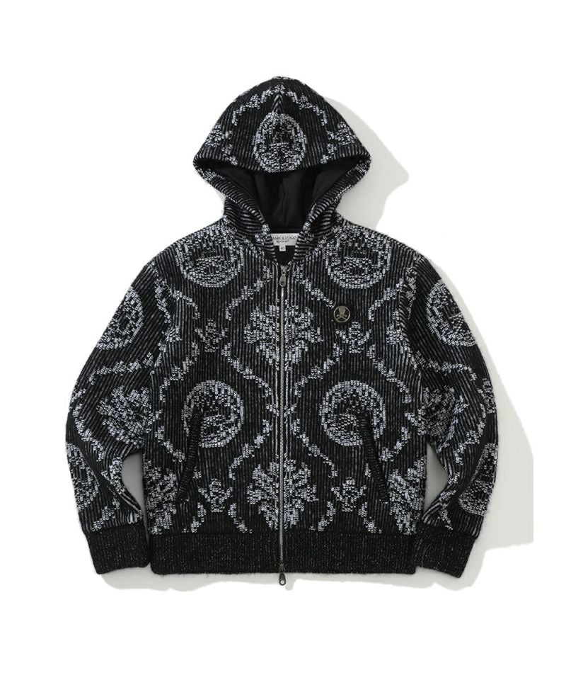 Made of a mohair blend popular for its fur length. Generally, mohair-blend materials tend to be thin, light, and somewhat unreliable, but this material contains nylon and spandex, so the knitted fabric itself is firm and bulky. It is also stretchable, allowing the knit to follow the body's movements while being worn. This material combines the shaggy, catchy look characteristic of mohair blends with practical comfort. Jacquard knit of such a good yarn and a high-count polyester yarn characterized by its flexibility and powdery touch. This technical knitted fabric expresses a damask pattern in three dimensions.