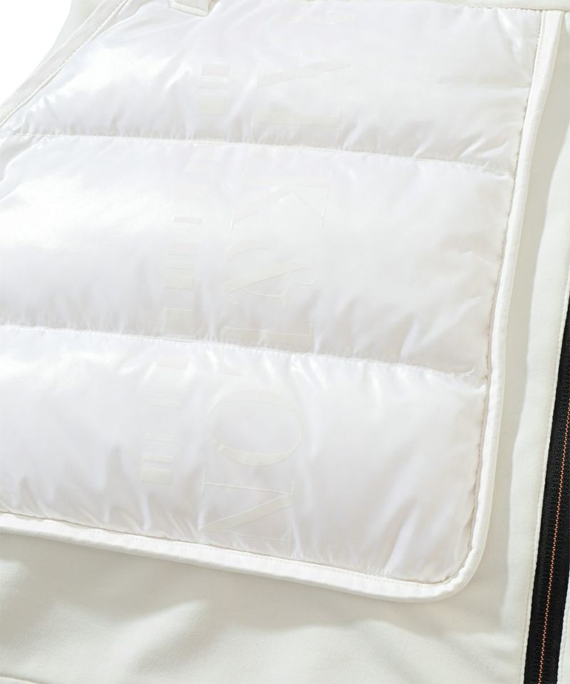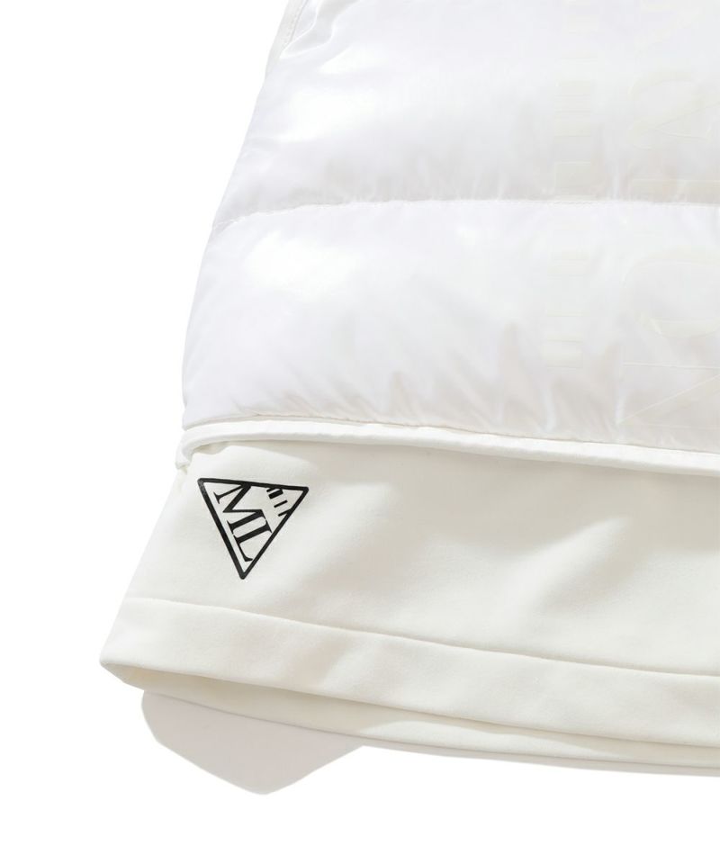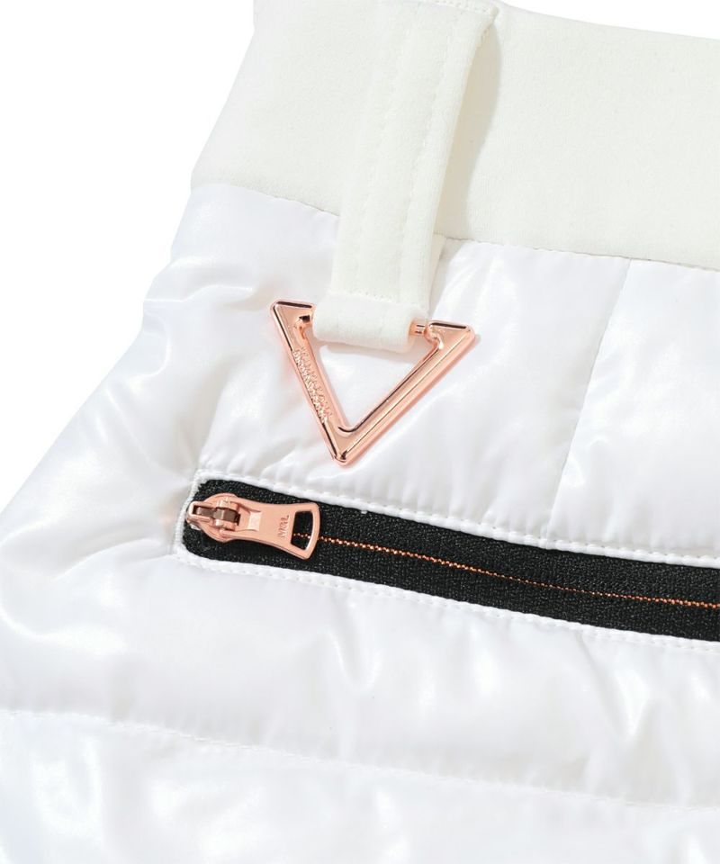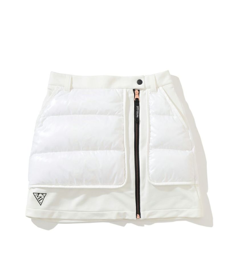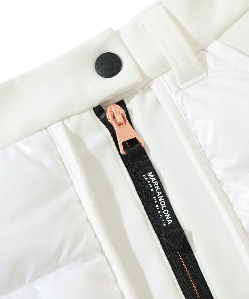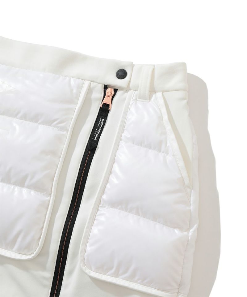 The asymmetrical design of this down skirt expresses CODE's unique style. Luxurious synthetic leather piping accents the design. The front and back skirt parts are made of high-density nylon taffeta, an imported material made by SOFILETA of France. While being lightweight, it is windproof, water repellent, and breathable, keeping the wearer dry and comfortable. The belt and main body are made of thin, supple microfiber for a superb feel. In addition, the high-density knitting makes this material extremely stretchy and the warmth of the inner lining can be felt. The skirt lining is also made of stretch material with windproof function.