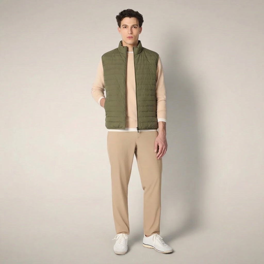 Built For Your Itinerary, the FYI model men’s puffer vest is a hybrid layer with a horizontally quilted front for light warmth. Details stay purposeful: a two-way zipper, standing collar, side zipped pockets, and elastic trims at the armholes and hem. Cut in breathable, four-way stretch fabric that packs down fast, it’s the slip-on solution for trains, planes, and everything in between.