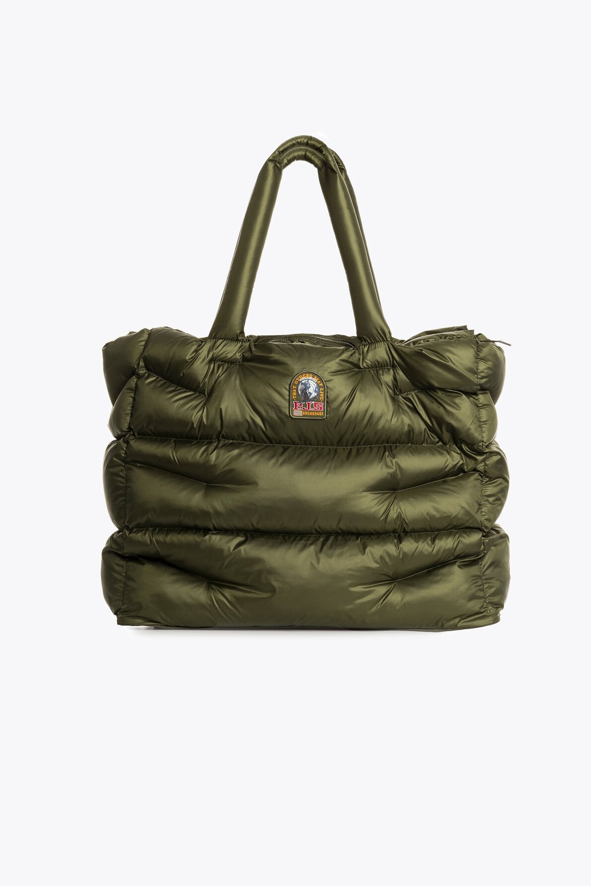 Hollywood Top Handle is a shopper bag made of 20-denier high-density nylon taffeta, semi-glossy, with a water-repellent finish and polyester padding. Zippered closure. One internal mesh pocket. Parajumpers patch on the front.
