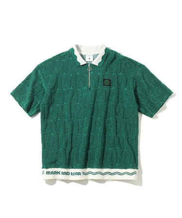 The pile side is made of soft, bulky, moisture-absorbent cotton, while the skin side is made of lightweight, kick-back polyester. The expressive 2-way stretch pile jacquard is both comfortable and textured. It is recommended to be worn as a set-up with pants (MLM-3A-AT10) using the same material and motif.