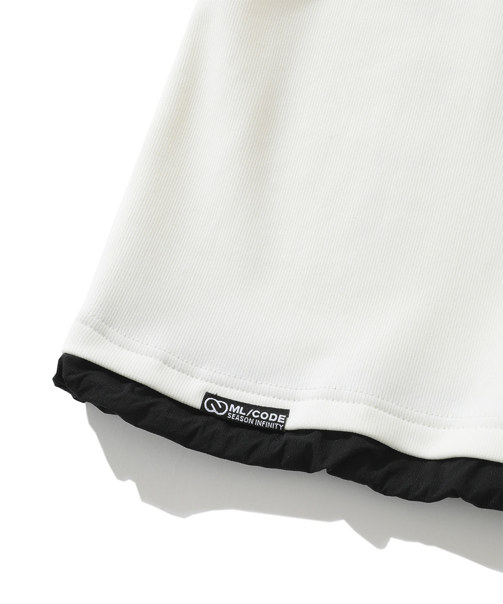Made of comfortable powder touch material. Delicately knitted with recycled nylon yarns featuring soft texture, smooth feel and high stretch. The hem is made of a stretchy matte taffeta material. The use of different materials creates contrast in the design while also providing an adjustable function.
