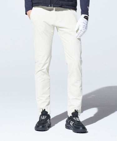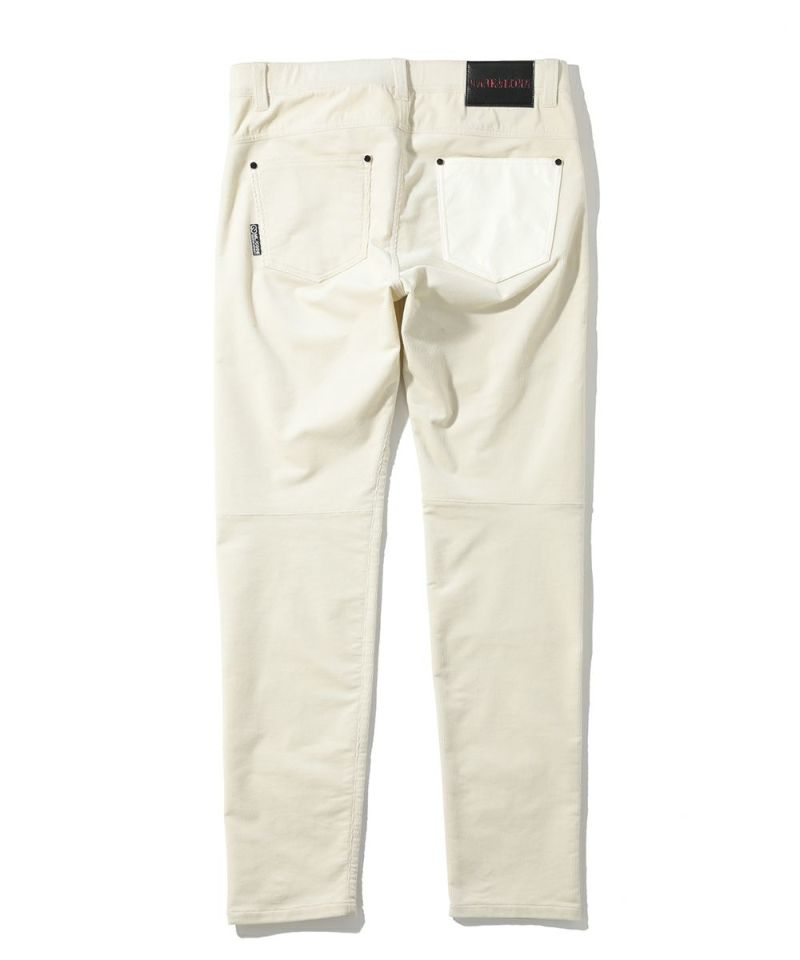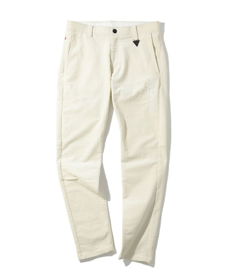 Double weave material with an elegant shiny cotton corduroy on the surface and soft pile on the reverse side. It is a versatile material that can be worn on any occasion with its sweatshirt-like comfort, warm texture, and reliable stretchability. Both side pockets are designed with slash pockets for easy access. A zippered pocket on the right side is also provided for sorting small items. Although the design is simple, this item is designed for comfort and convenience during play.