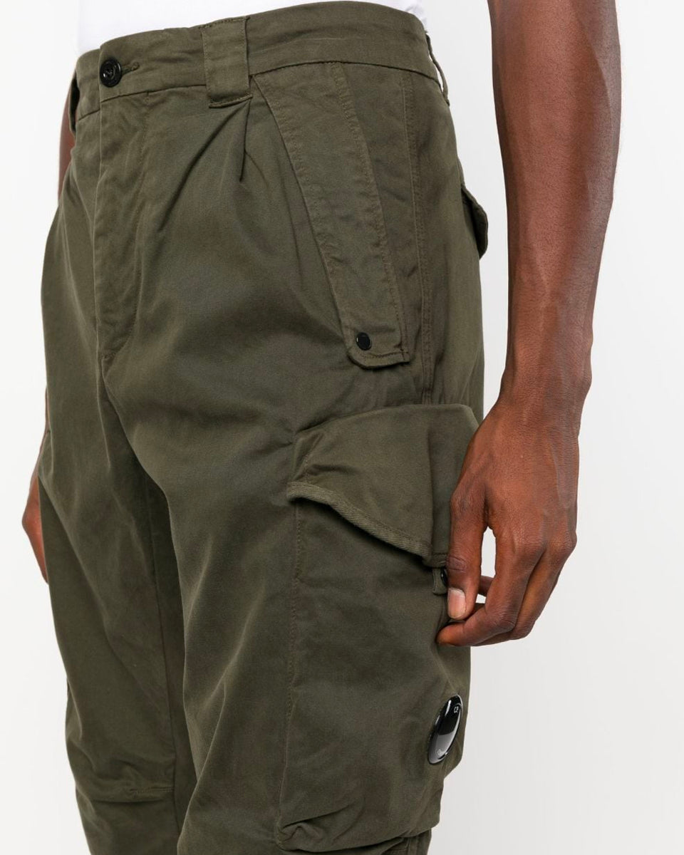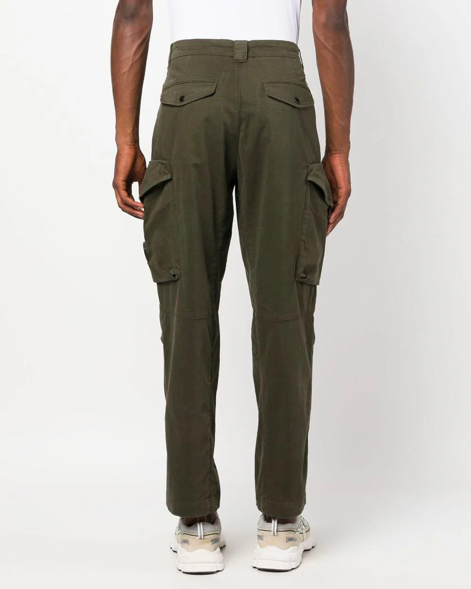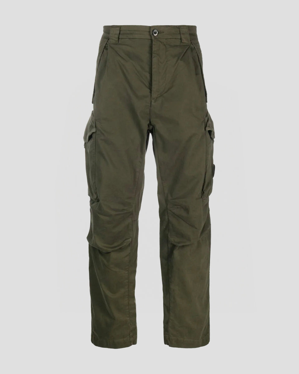 Cargo pants in our loose fit, featuring two cargo pockets, one of which has the C.P. Company Lens detail. The pants are also constructed with belt loops, a zip fly and button fastening. Manufactured in lightweight Stretch Sateen, a matte cotton textile with built-in extensibility, for a flexible and durable fit, and garment dyed for an increased chromatic depth and intensity throughout.