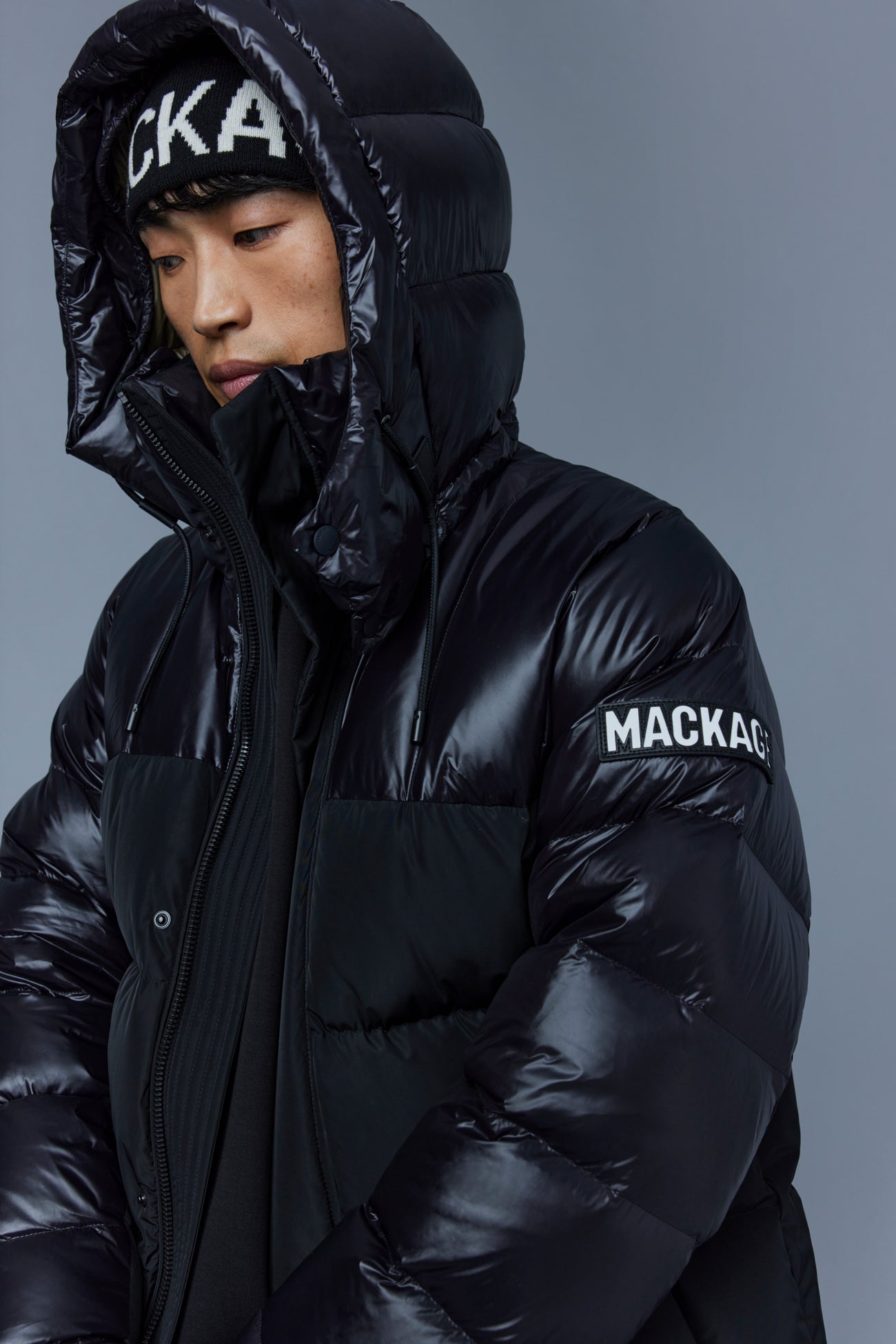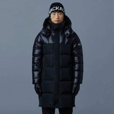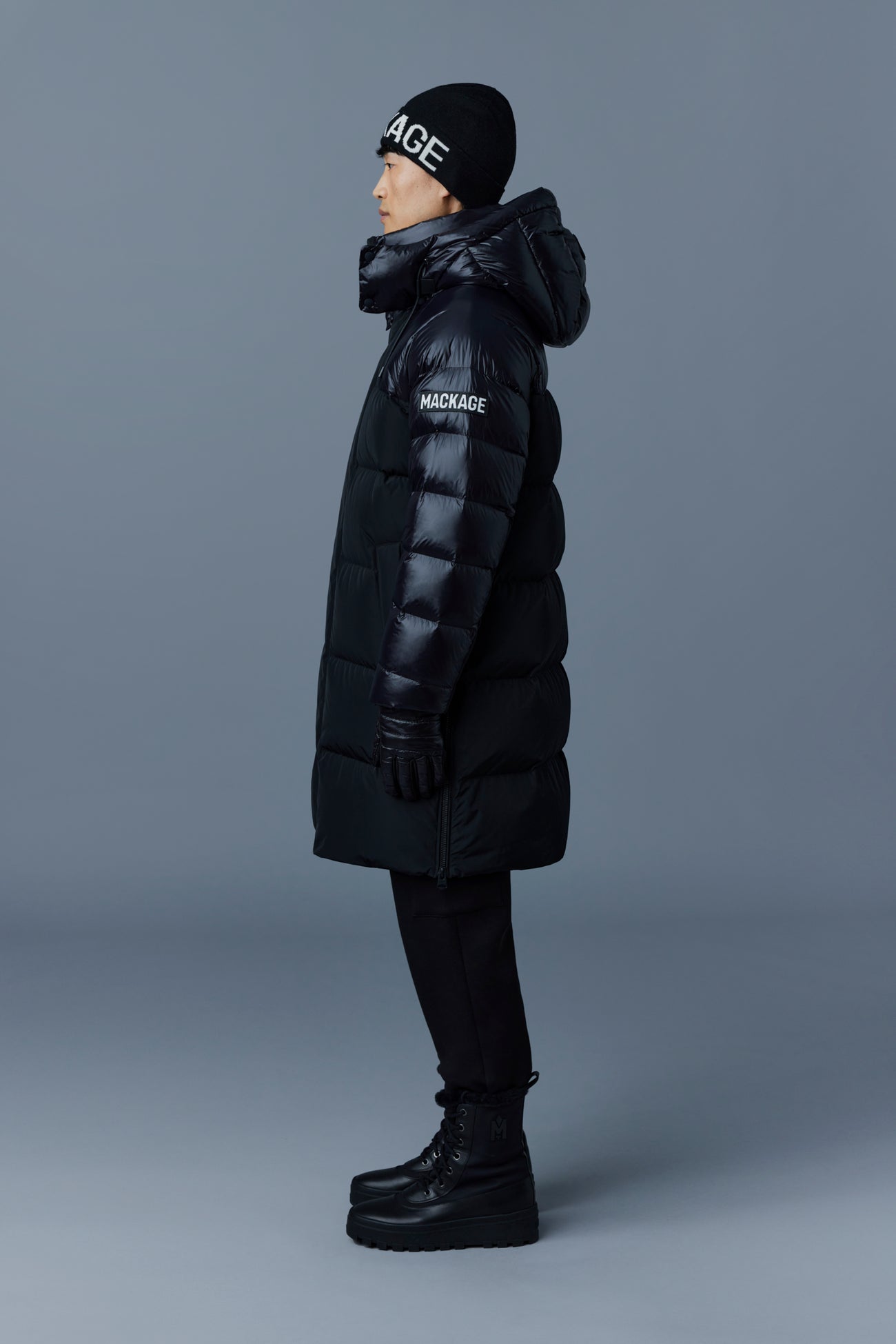 KAZUYA is a long recycled down coat with a mixed-media shell. Designed for ultimate warmth, it showcases a removable hood with drawcord storm visor and a hidden snap storm placket. Insulated waist pockets and zippered side vents bring versatility. A classic cut, the contrast quilted yoke and sleeves add modern detail.