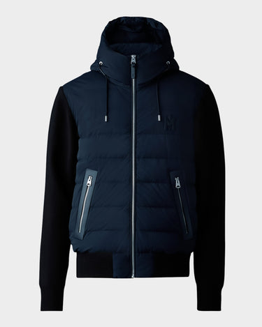 ANDREW is a light down quilted jacket with a non-removable hood. Cut to a regular fit, super soft knit adorns sleeves, back, and waistband for a hybrid style. Zip waist pockets provide ample storage while signature M at chest adds subtle detailing. A highly wearable modern performance piece.
