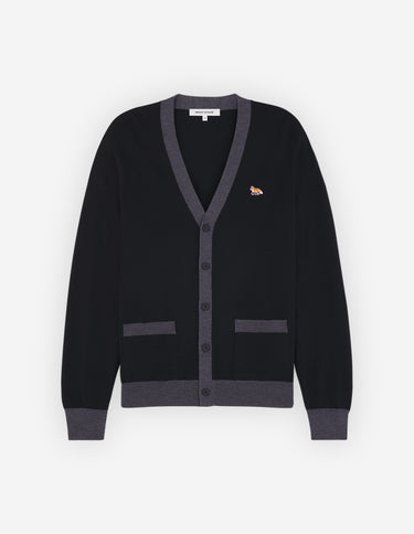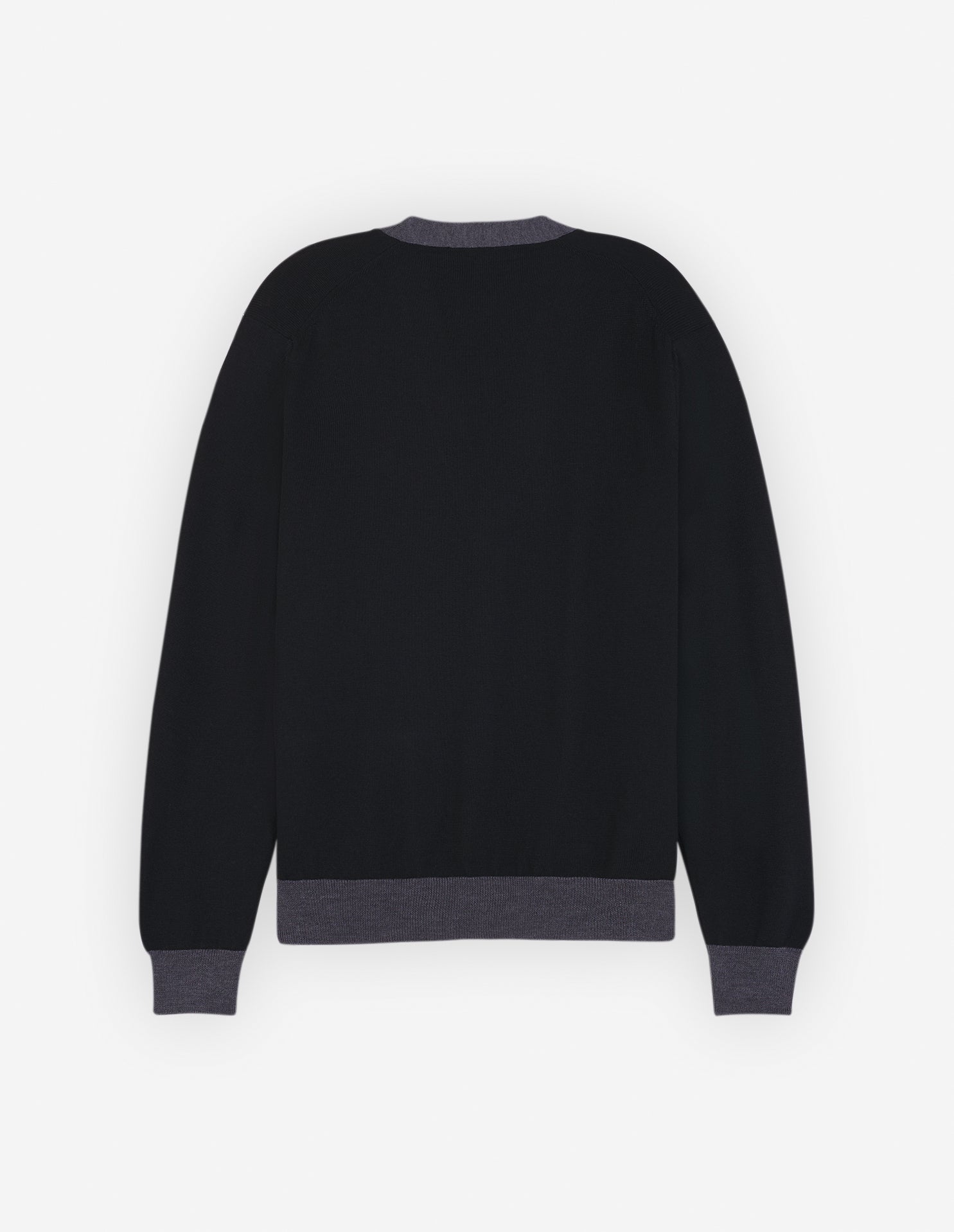 Bi-color merino wool V-neck cardigan. Classic cut with Baby Fox patch embroidered at the chest.