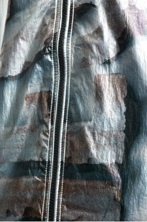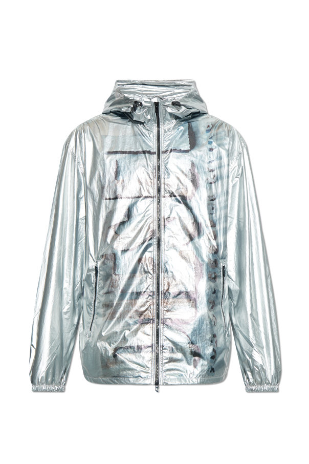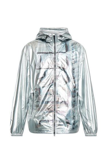 This men’s hooded jacket by Diesel is crafted from a shiny, metallic silver fabric that delivers a modern, futuristic look. Designed with a relaxed fit, it features a full front zip closure, abstract surface patterns, and prominent seam detailing for a unique touch.