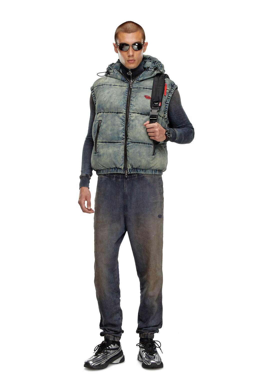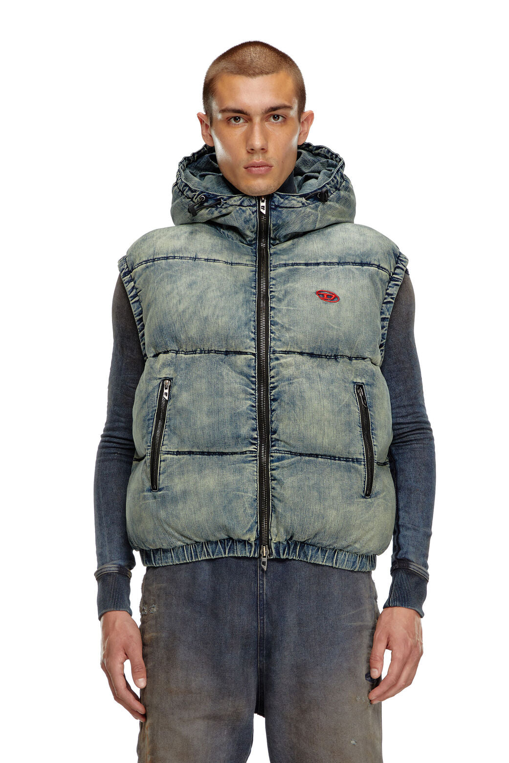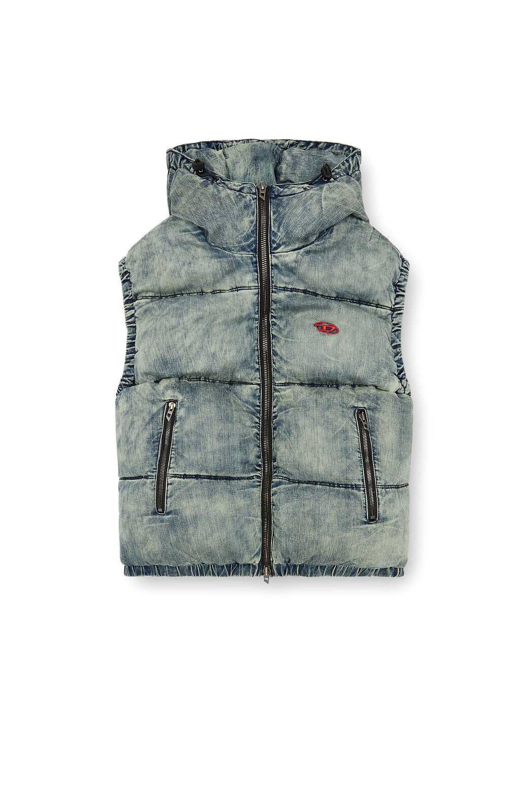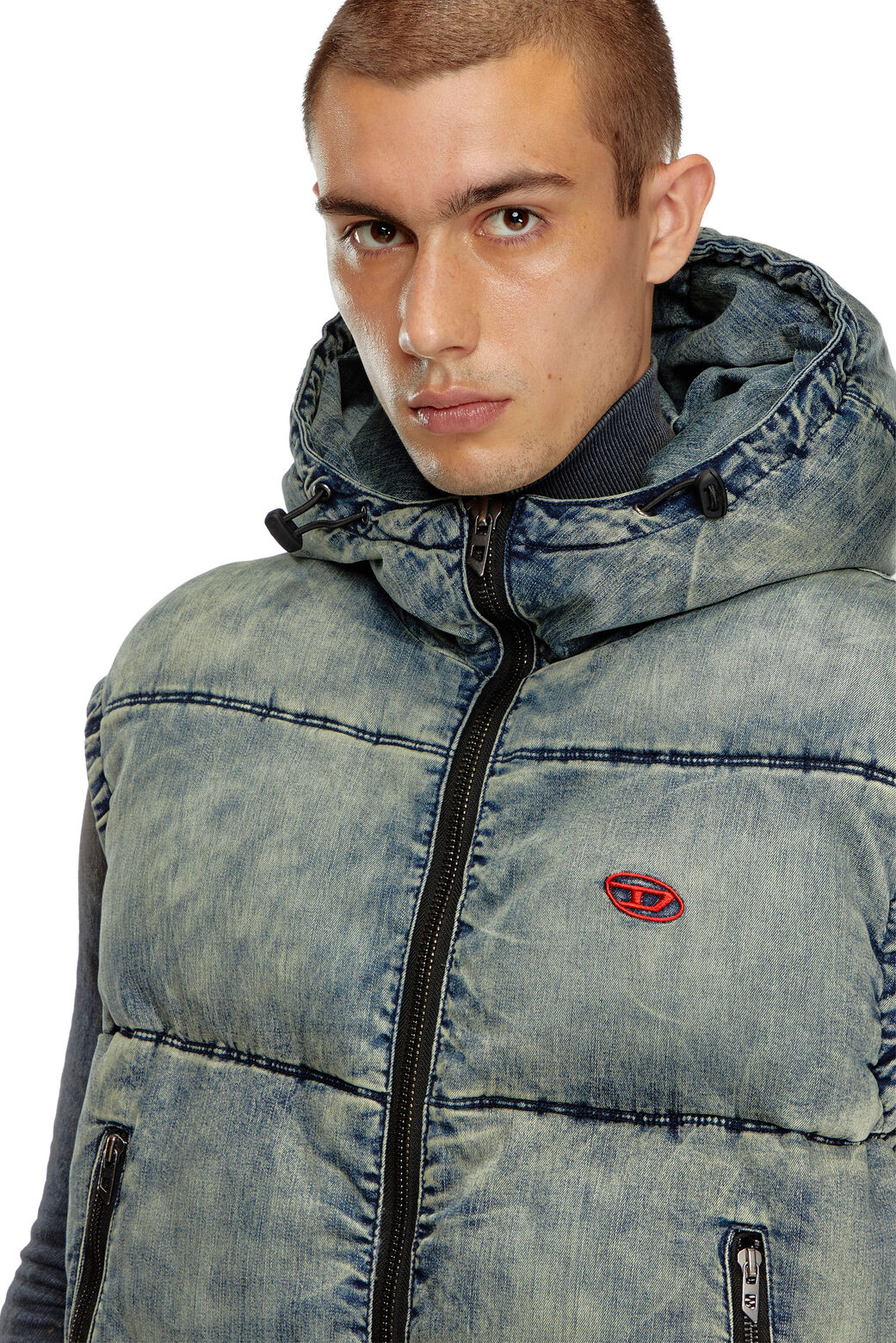 Quilted vest built from blue cotton-viscose denim, containing a hint of stretch for comfort and heavily faded for worn-in look. Generously padded, this men's style features a bungee cord hood and a contrast embroidered Oval D logo on the chest.