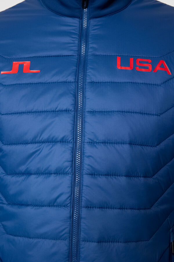 Introducing our technical Maurice Hybrid Jacket, designed for superior performance and style. Crafted from water-repellent, lightweight fabric with 4-way stretch, this piece guarantees quality with Bluesign certification. Maurice features a 2-way full zip front closure with a stay-down puller, and the padded nylon sections at the chest and back provide added warmth with quilted padding to enhance its sporty look. It is decorated with an embroidered USA flag patch on the sleeve and a Bridge and USA logo printed on the chest.