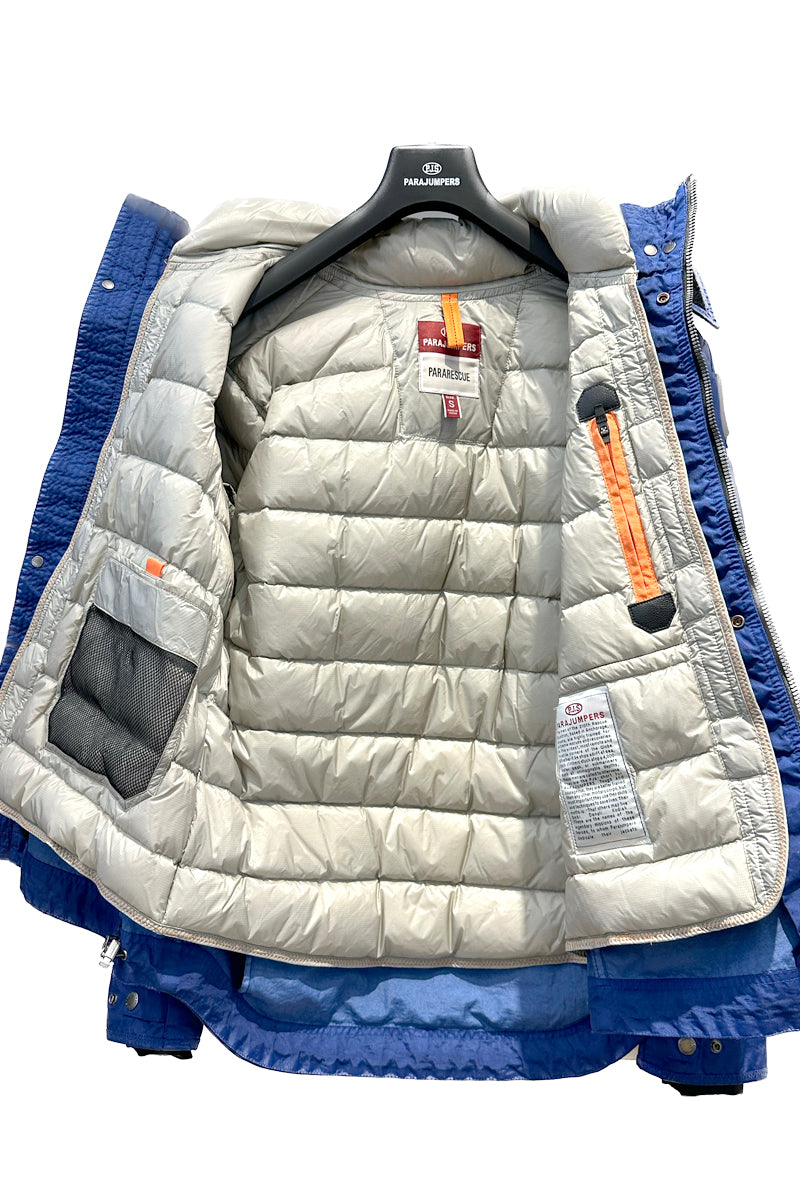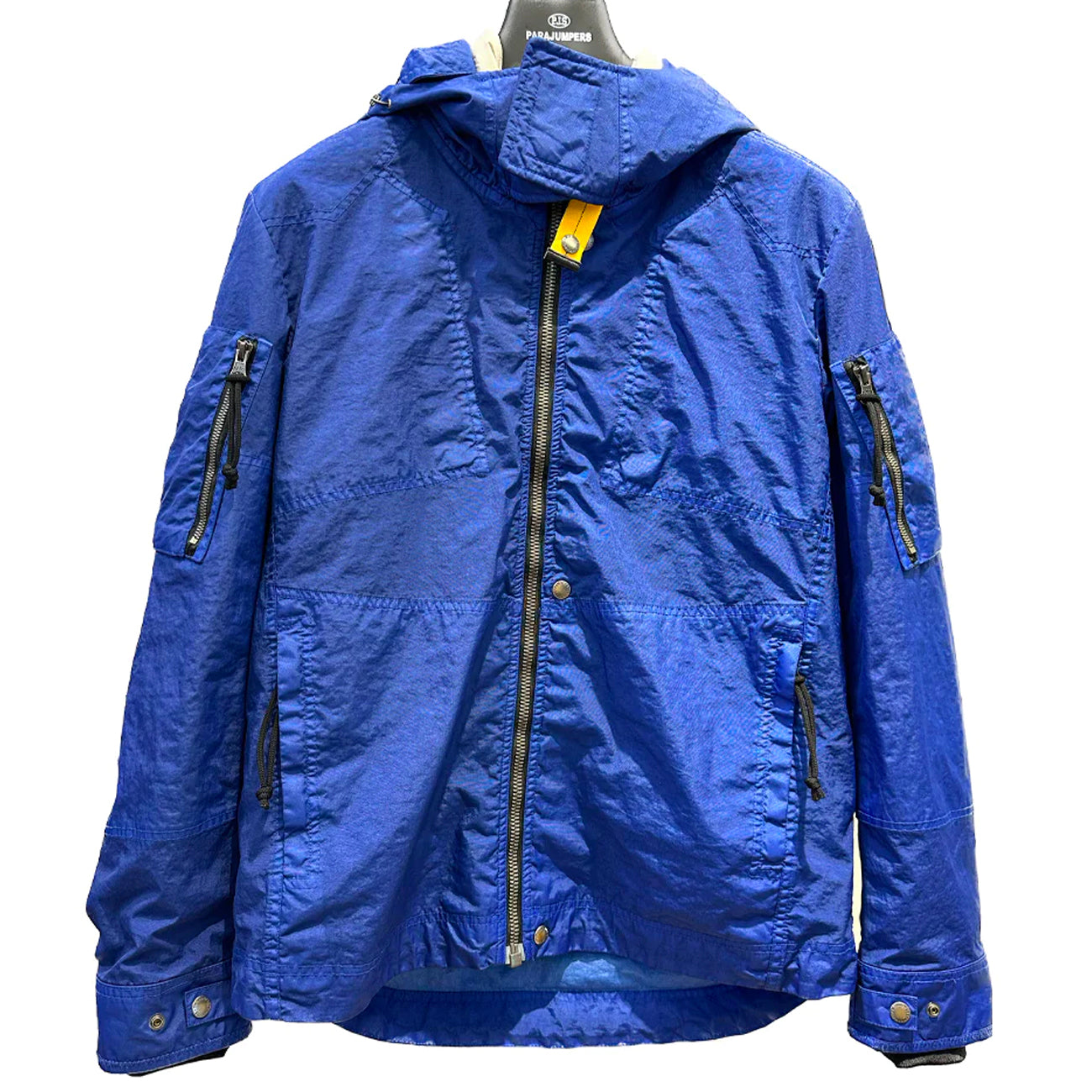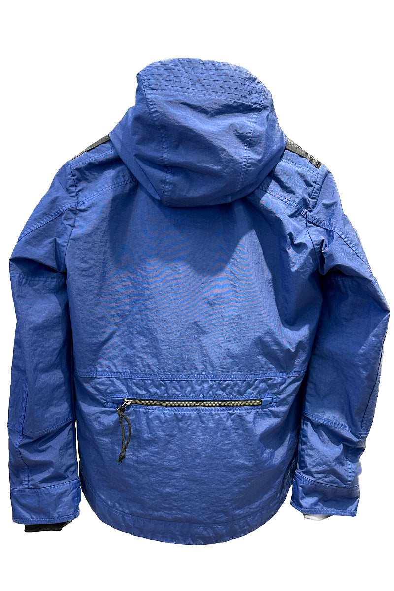 The jacket is garment dyed and crafted in nylon canvas with polyurethane coating and water repellent treatment. The body warmer is crafted in light 10 den nylon ripstop with cirè on the back and water repellent treatment. Buttoned and drawstring hood with velcro storm latch. Two front zippered pockets and two zippered pockets on the sleeves. Detachable puffer lining with two inner pockets, one mesh and one zippered. Front zipper with inner button-up storm flap. Bottom and cuffs adjustable with buttons. Ribbed inner cuffs. Zippered pocket on the back. Iconic yellow elastic strap neck closure and PJS patch on left sleeve.