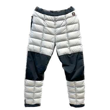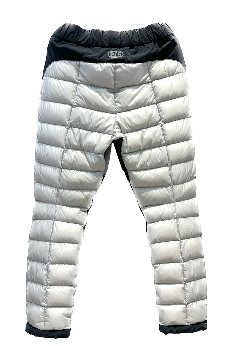 Extra light down-filled technical pants with square padding. The pants are crafted in two fabrics: the main one is 10 den shiny nylon ripstop with water repellent treatment and PU coating on the back while the second one is stretch nylon-elastane micro reps with water repellent treatment. Elasticated waist adjustable by means of a tape. Two zippered pockets. Drawstring ankle cuffs. PJS reflective logo on the back. Iconic PJS patch on the left front side.
