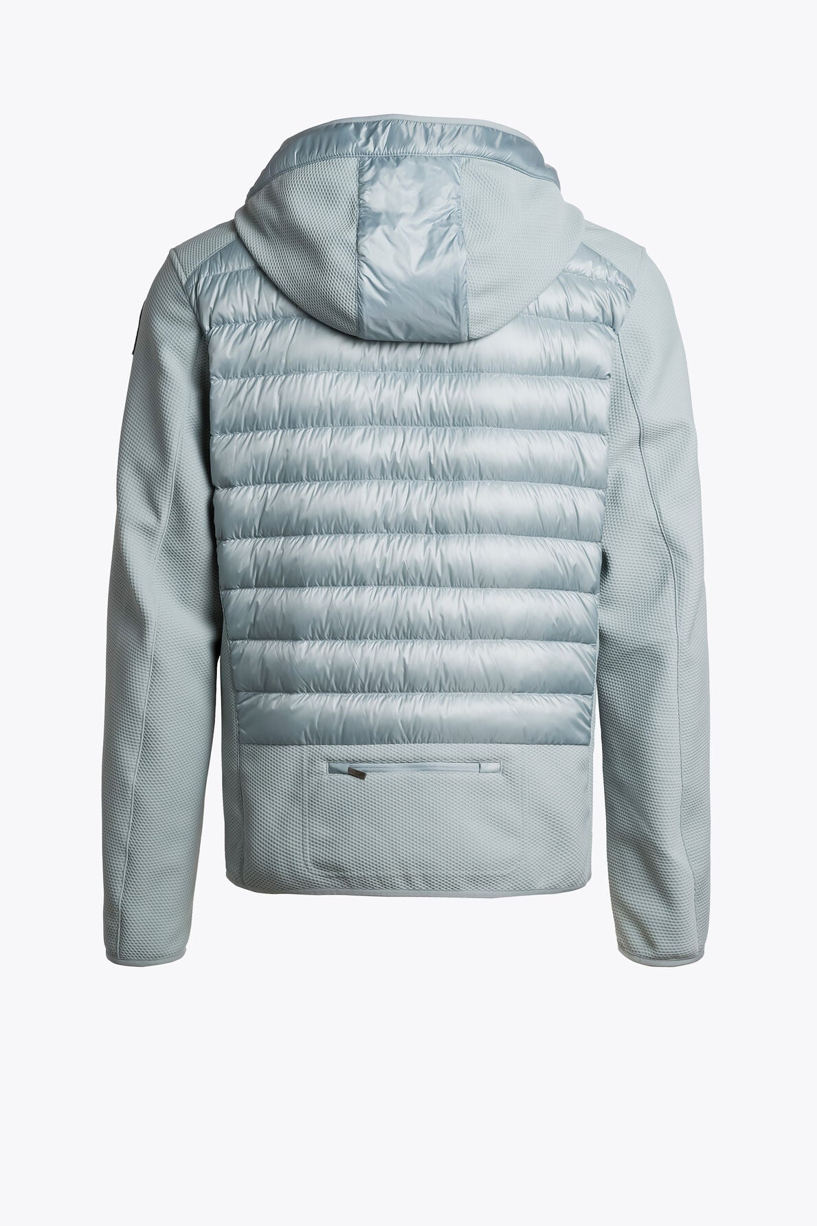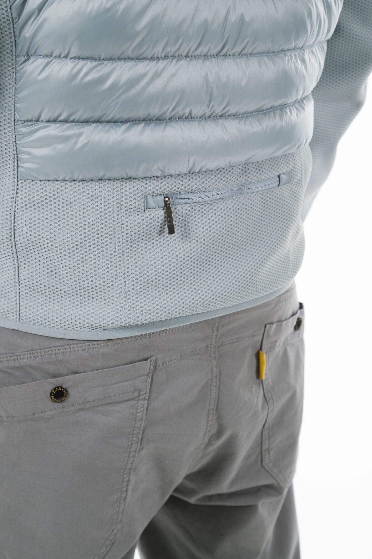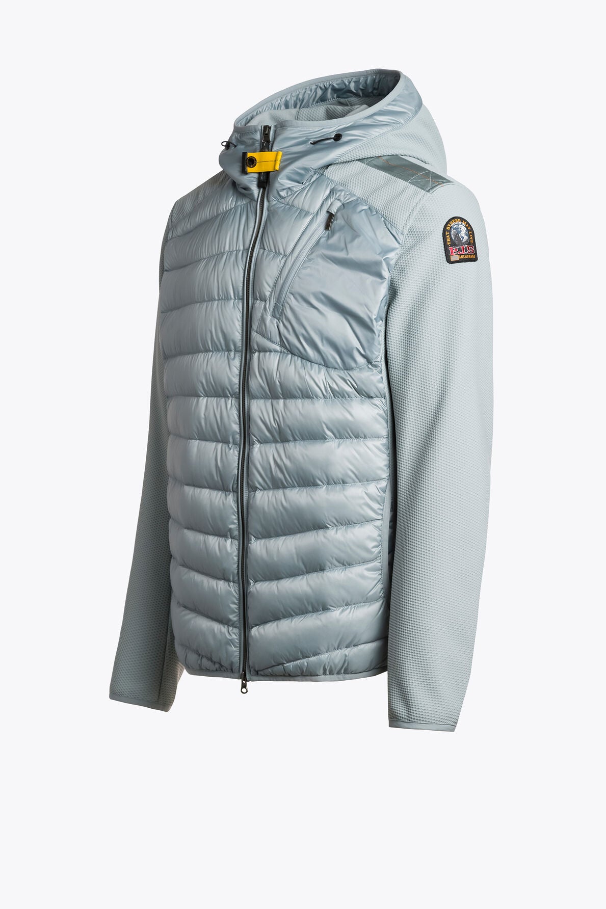 This jacket has a hood adjustable by means of a drawstring and a two-way zipper. It features three front pockets, a small zippered pocket at the back, as well as two inner pockets. Lycra trimmed cuffs, hood and bottom hem, and pockets, underarm ventilation. It features iconic details such as the yellow tape and the patch. The main fabric is a super light 20 den down proof semi-shiny taffeta, 100% recycled nylon, with water-repellent treatment. The second fabric is a polyester honeycomb knit bonded with soft fleece, 80% polyester – 20% elastane, with water-repellent treatment. Filling is duck down.
