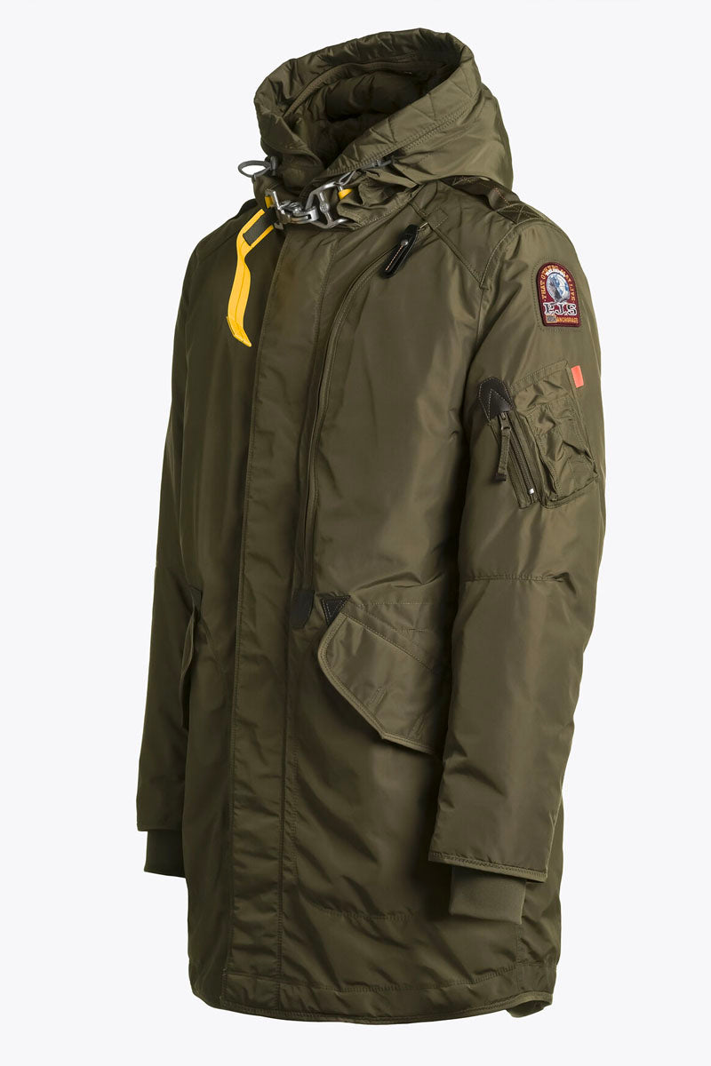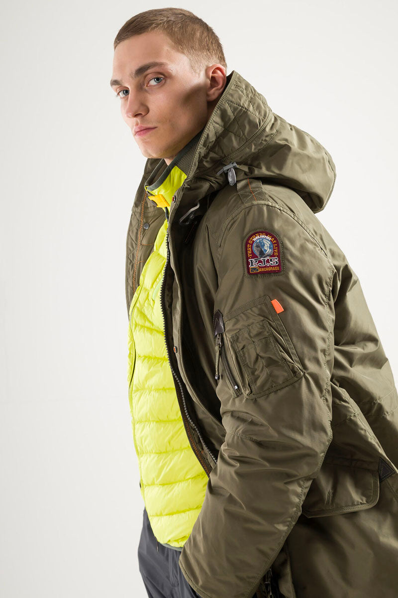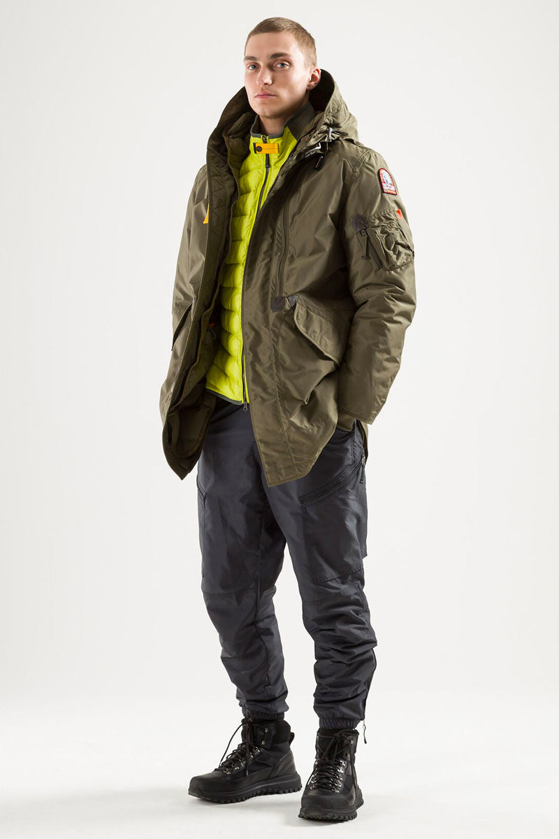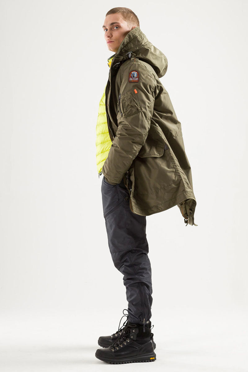 The Tank parka is an all-time favourite with a sleek design for an urban lifestyle. With the iconic Parajumpers details, like the cargo pocket and the yellow elastic strap with hook inspired by the one used by parachutists.