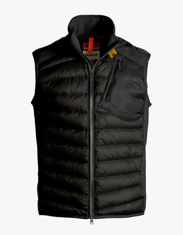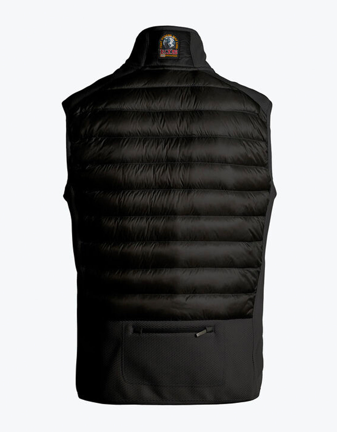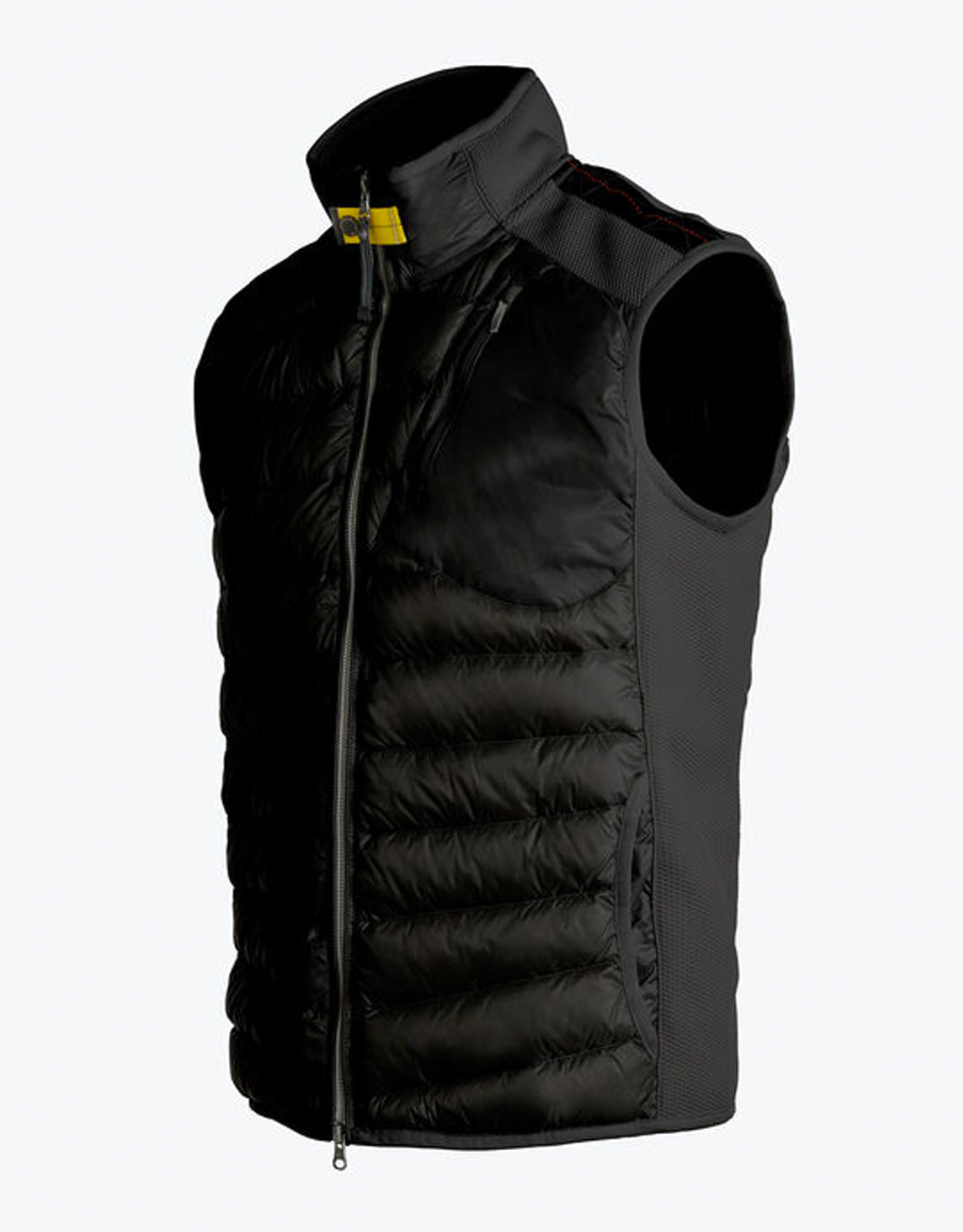 Vest made of a polyester honeycomb knit bonded with soft fleece on the inside and featuring down-filled super light 20 den down proof semi-shiny taffeta inserts with water repellent treatment. Three front pockets, a small zippered pocket at the back, as well as two inner pockets. Two-way zipper. Lycra trimmed bottom, armholes, collar, pockets. Iconic yellow elastic strap neck closure and PJS patch on the left sleeve.