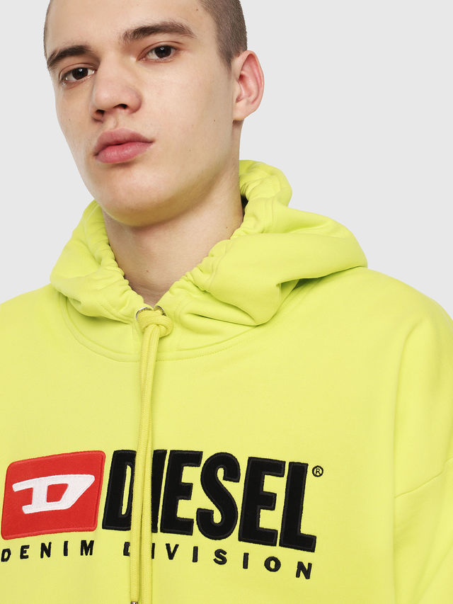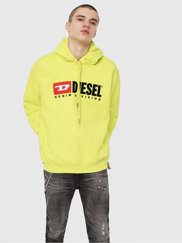 Straight out of Diesel's archives, this iconic hooded sweatshirt touts the classic '90s logo, reworked in tactile felt and embroidery: the distinctive D and the seminal slogan "Denim Division". The tried-and-true sporty silhouette features slightly dropped shoulder seams, a durable metal-end drawstring at the hood and ribbed trims.