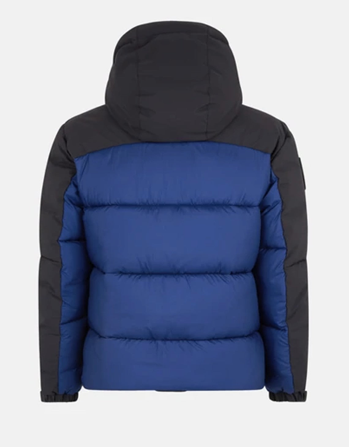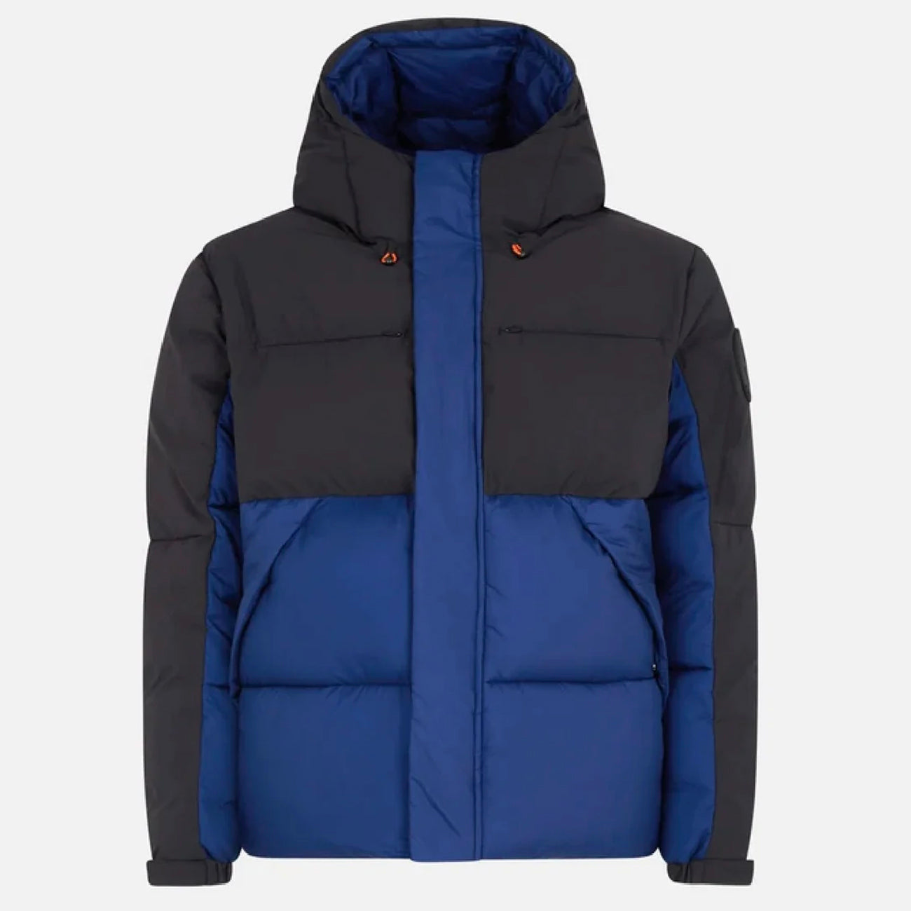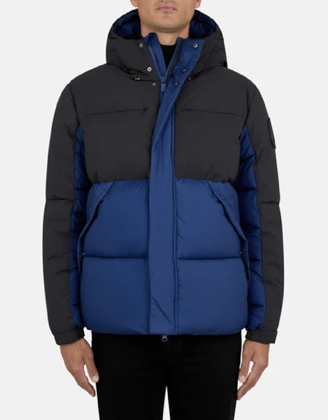 A quilted, water repellent jacket made from a combination of 100% nylon and 100% recycled polyester fabrics. Featuring a water repellent upper and hood with an adjustable drawstring as well as a drawstring to cinch the bottom. Equipped with a central double slider zip, double chest pockets enclosed by zips and two side pockets. The jacket is finished with a "100% Animal Free" message on the center of the inside of the jacket and a maxi logo on the left sleeve.