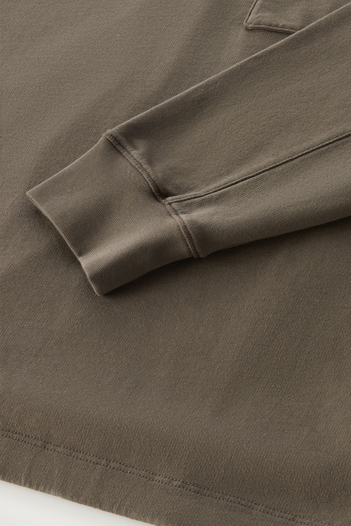 A versatile garment that is perfect for the in-between seasons. Our crewneck is made with extra light organic pure cotton fleece. It features ribbed cuffs, a zipped pocket on the chest for small items, and a silicon badge on the left sleeve.