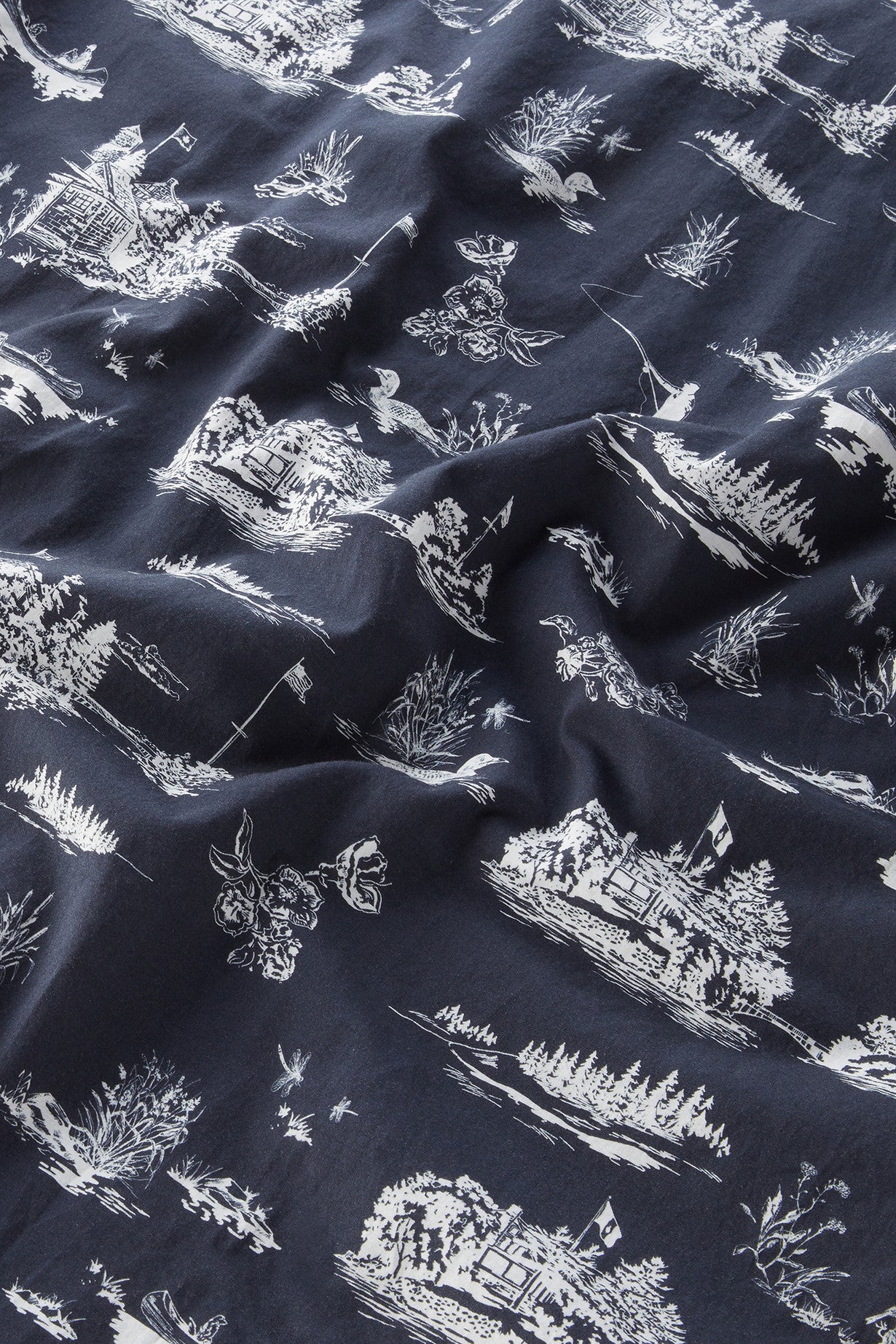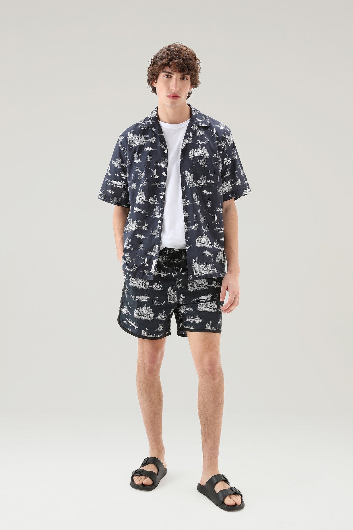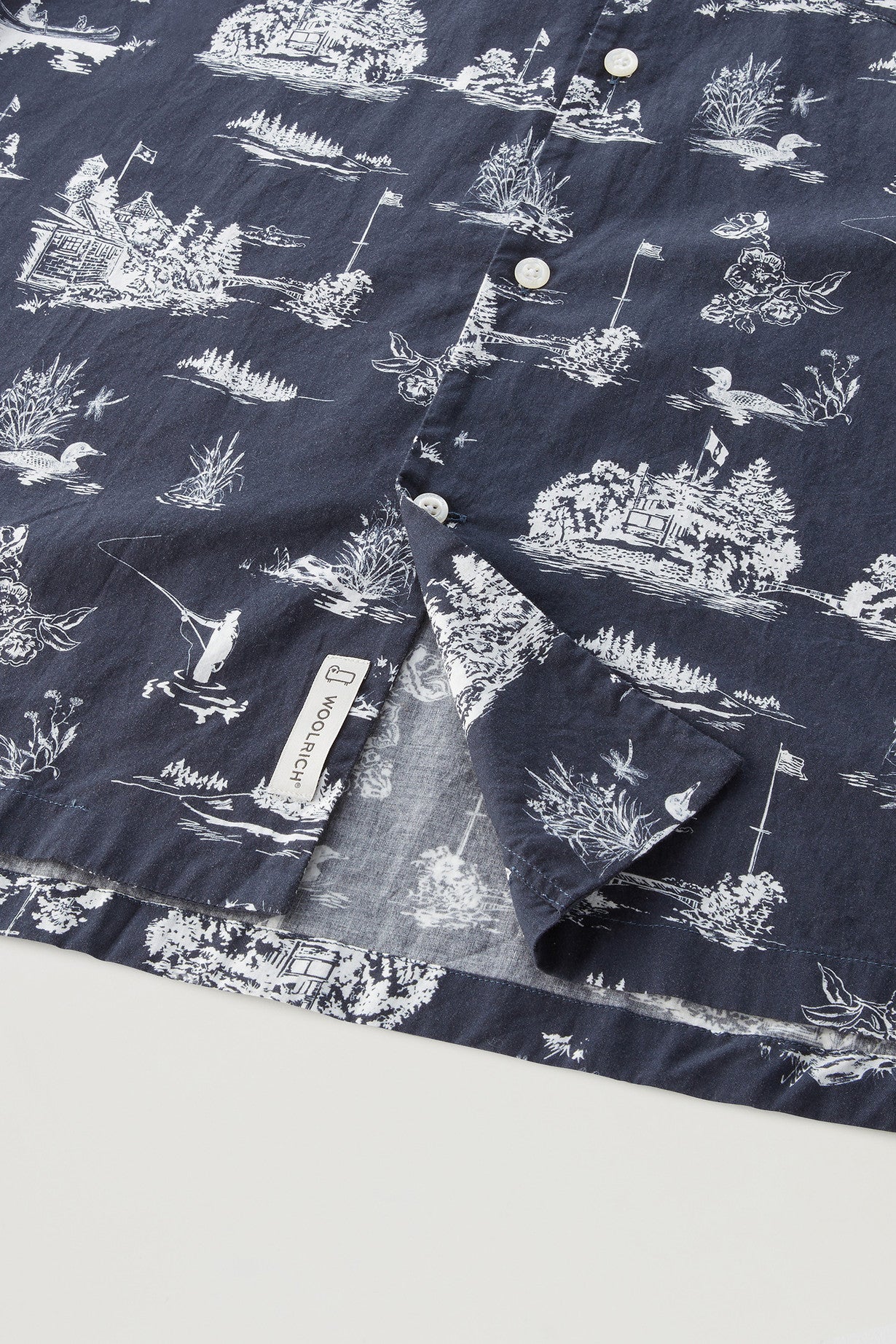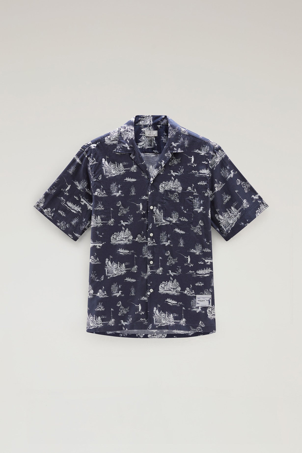 A lightweight, on-trend design that will see you through the season in style and comfort. This short-sleeved shirt is made of pure cotton poplin and features a vintage-inspired camp collar and a print of Zavikon Island honoring Woolrich's connection to its roots. It has a button closure and a patch pocket on the chest. It also has a dedicated label that honors Zavikon Island.
