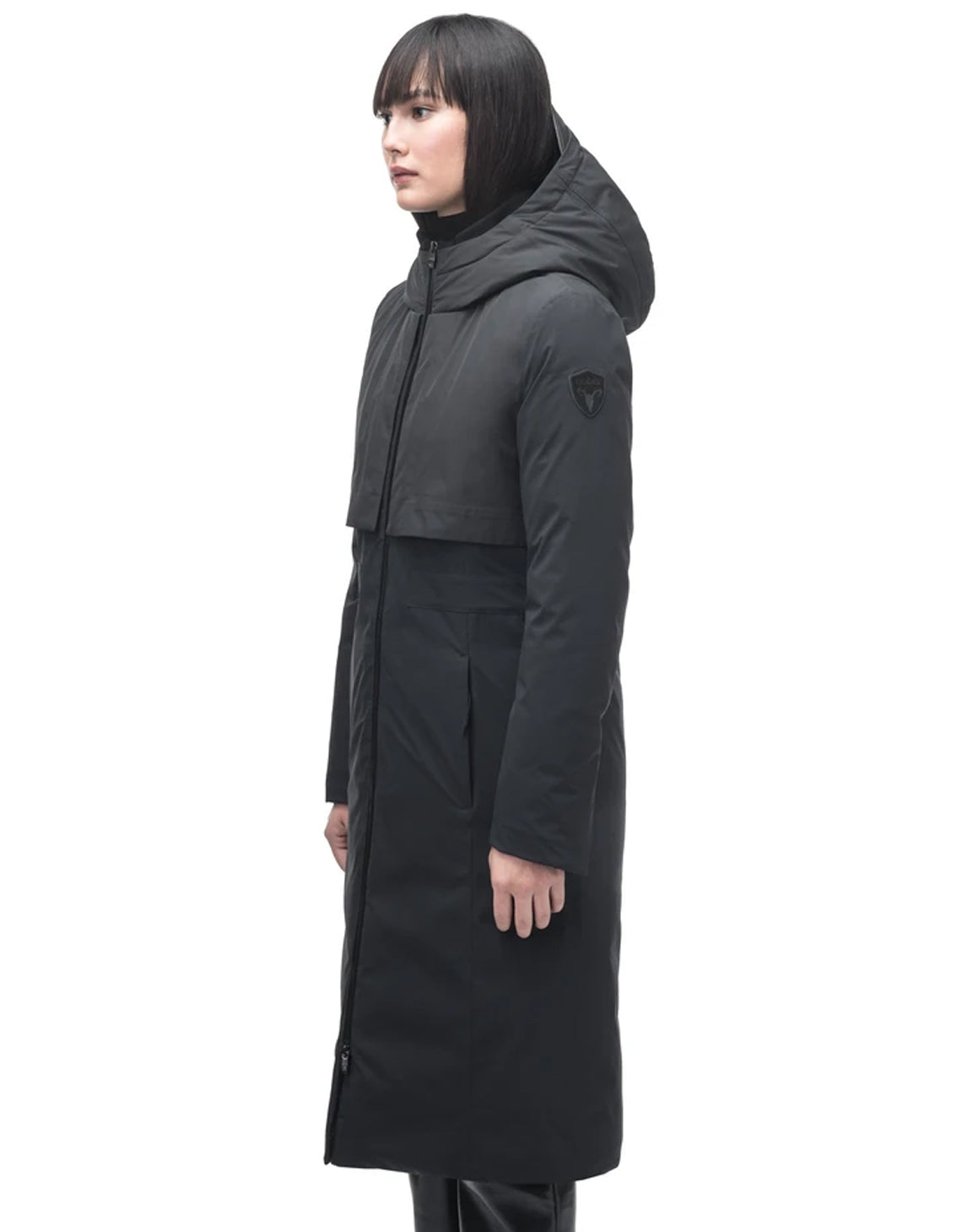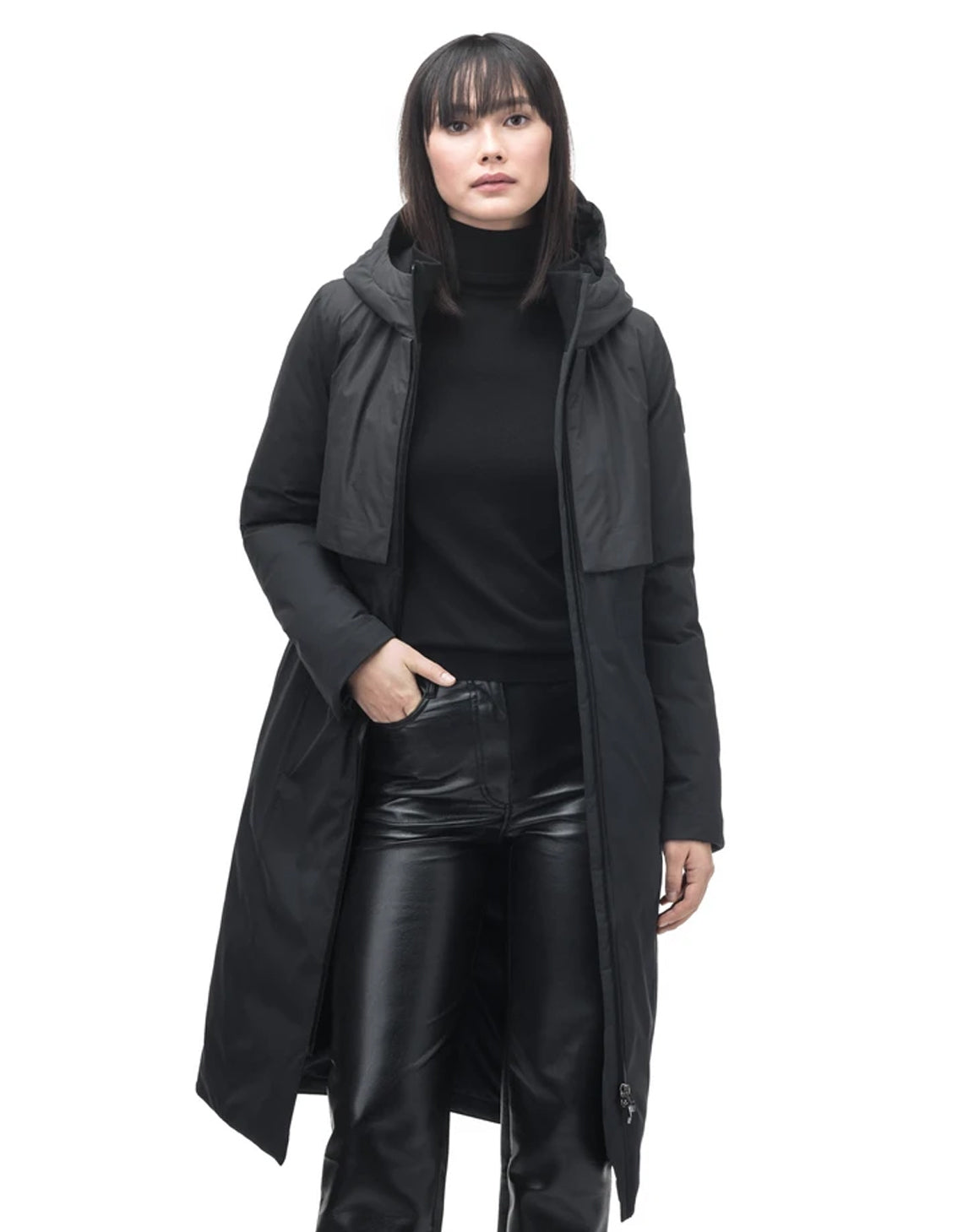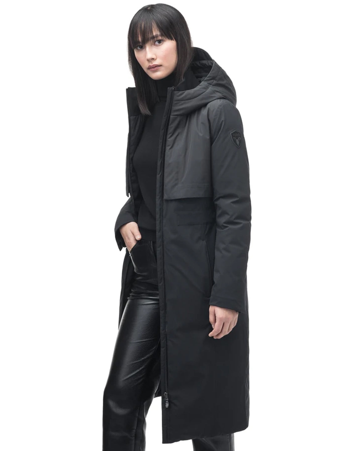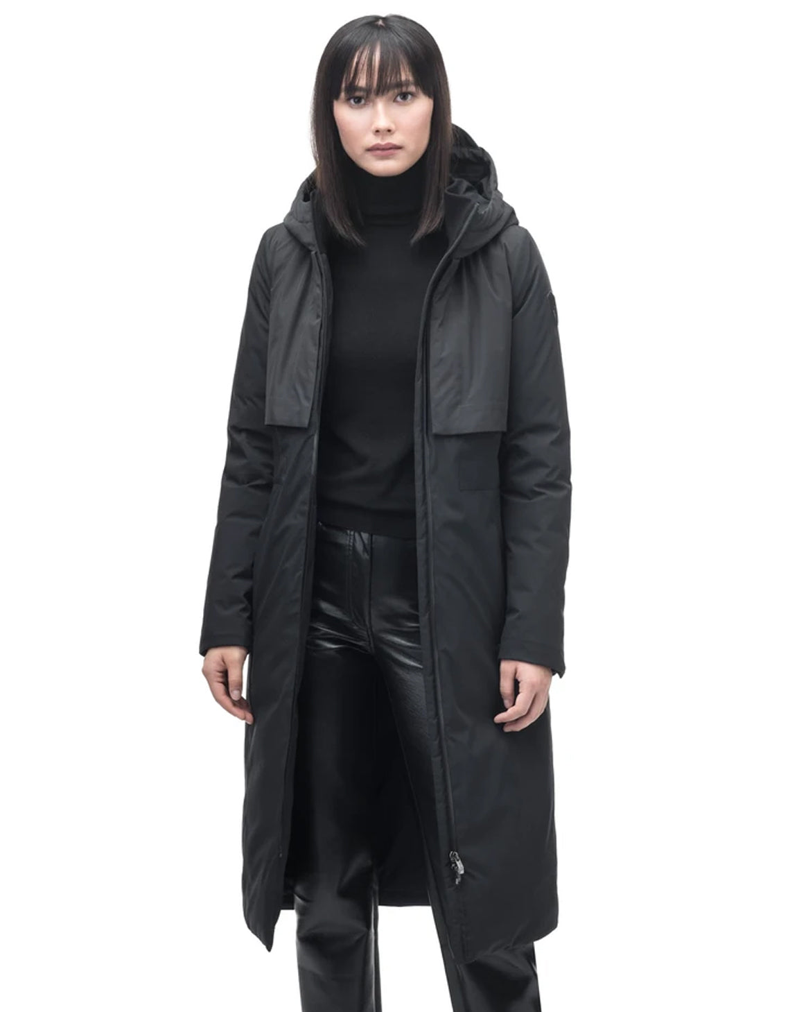 Made from premium stretch ripstop and breathable fabric designed to withstand water and wind, this streamlined parka is also laminated with our exclusive Embrace interior membrane and insulated with Canadian duck down fill. Magnetic-closure chest flaps conceal handy mesh-lined pockets, while an elasticized waist with hidden draw cord allows for an adaptable fit. Adjustable button cuffs and a down filled hood offer added protection against the elements.