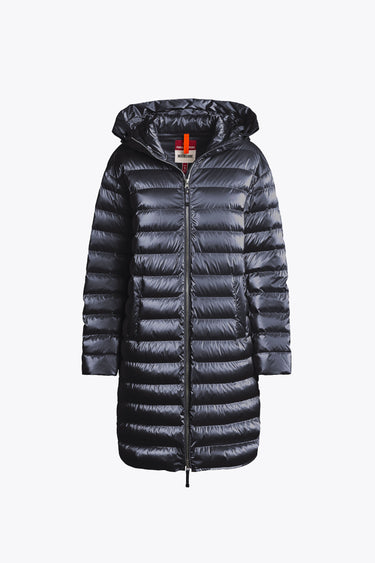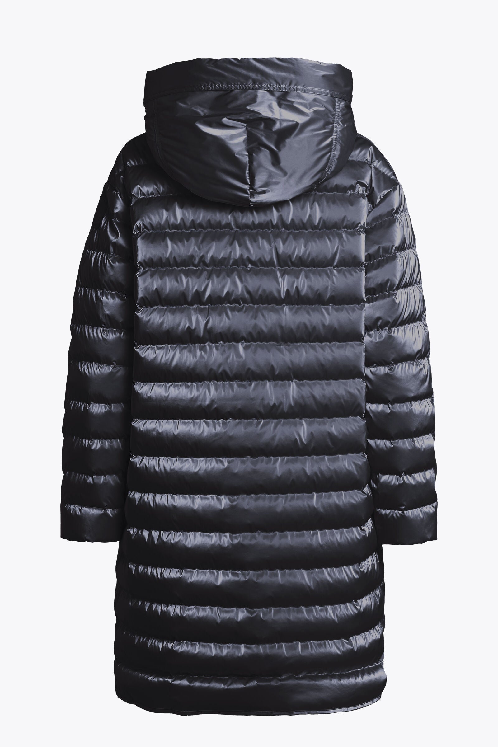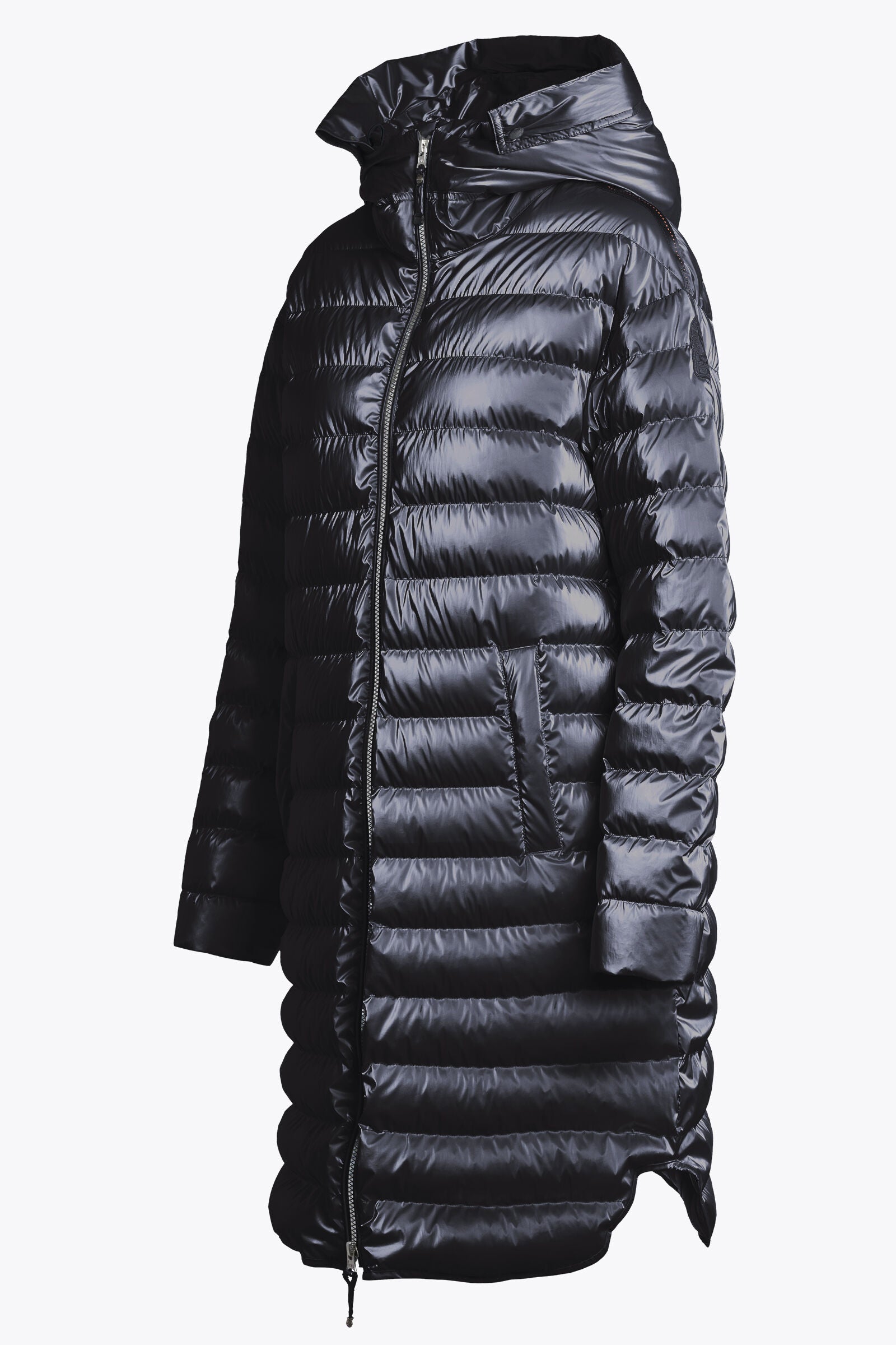 This jacket features a hood adjustable by means of drawstring and a two-way zipper. Two snap pockets. Iconic details such as the patch. The fabric is a nylon taffeta, with a coloured and shiny polyurethane lamination on the face side. Filling is 90/10 down and feathers.