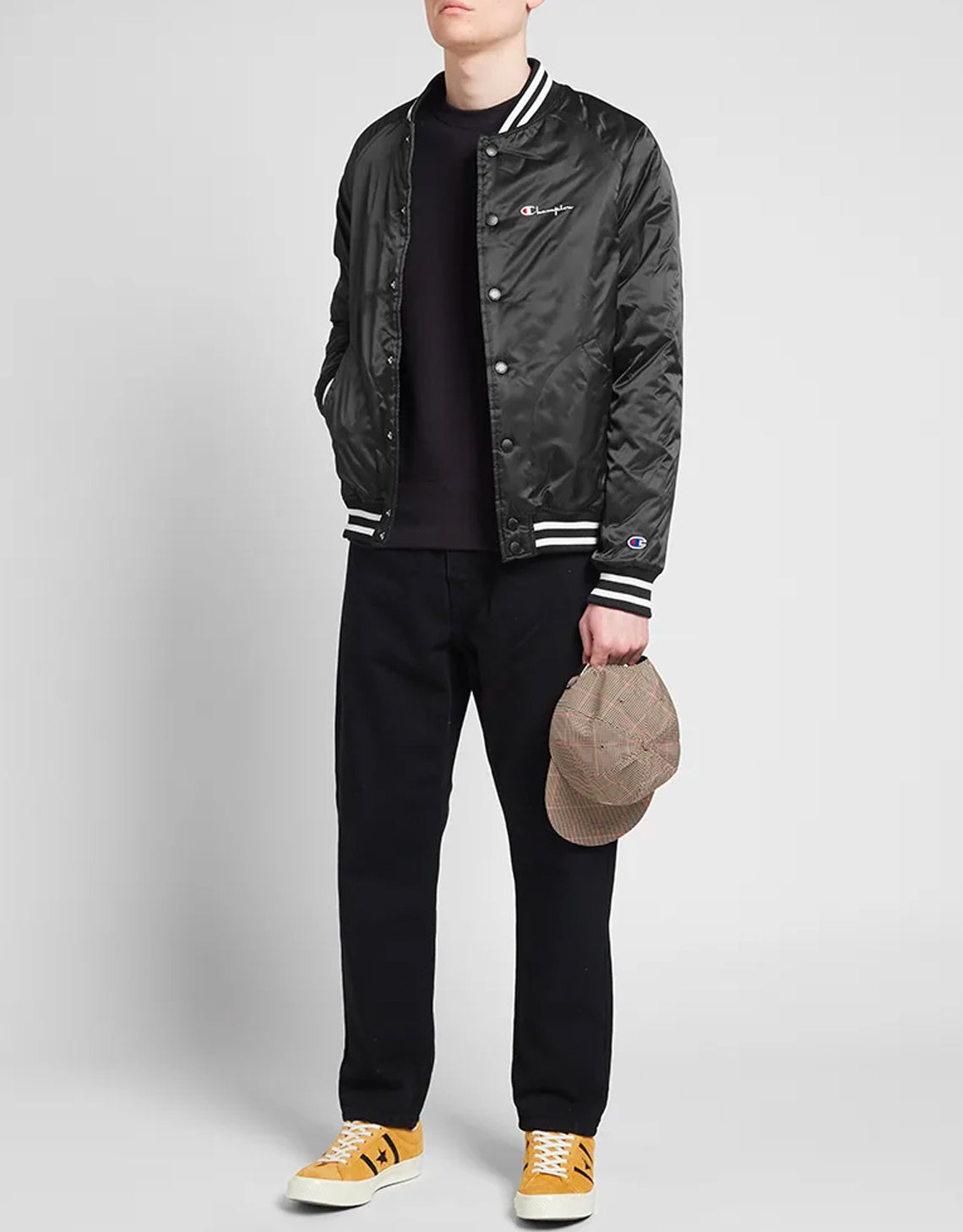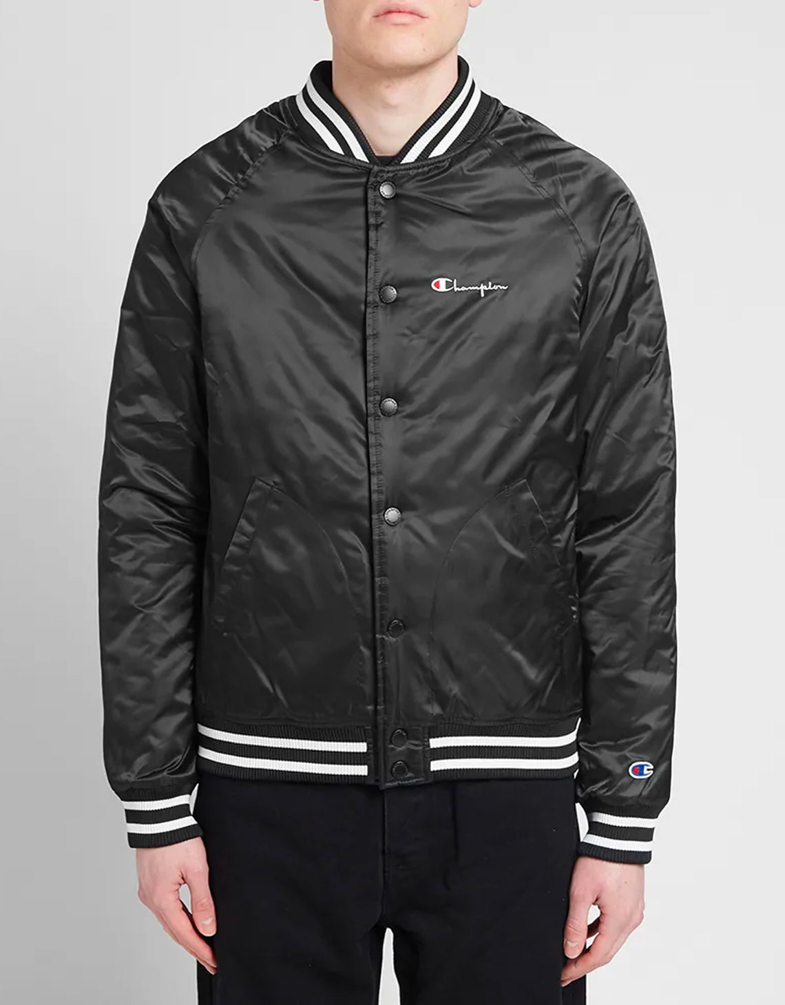 As a long standing icon of the American sportswear industry, Champion is renowned for producing contemporary classics like this black satin bomber. The bomber is an emblem of mid-century Americana, and Champion’s incarnation doesn’t disappoint, with matte black press stud closure, the label’s instantly recognisable branding and monochromatic cuffs, hem and collar.