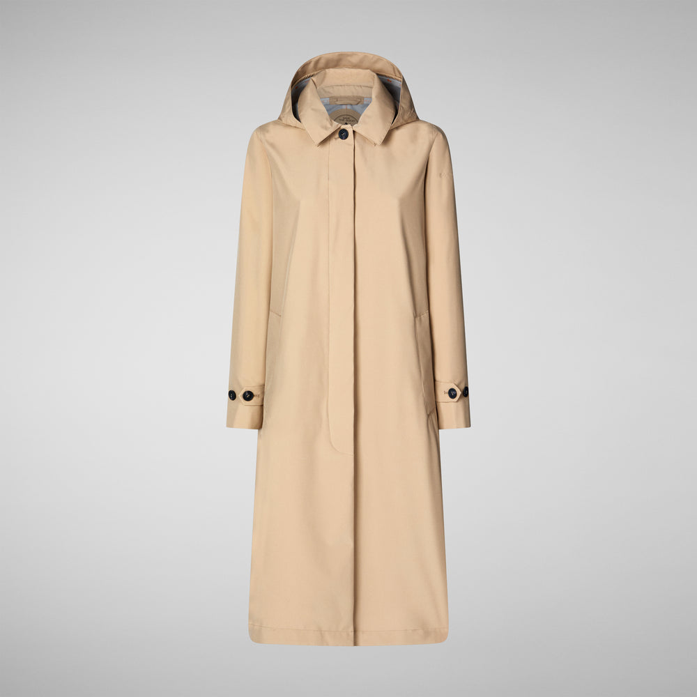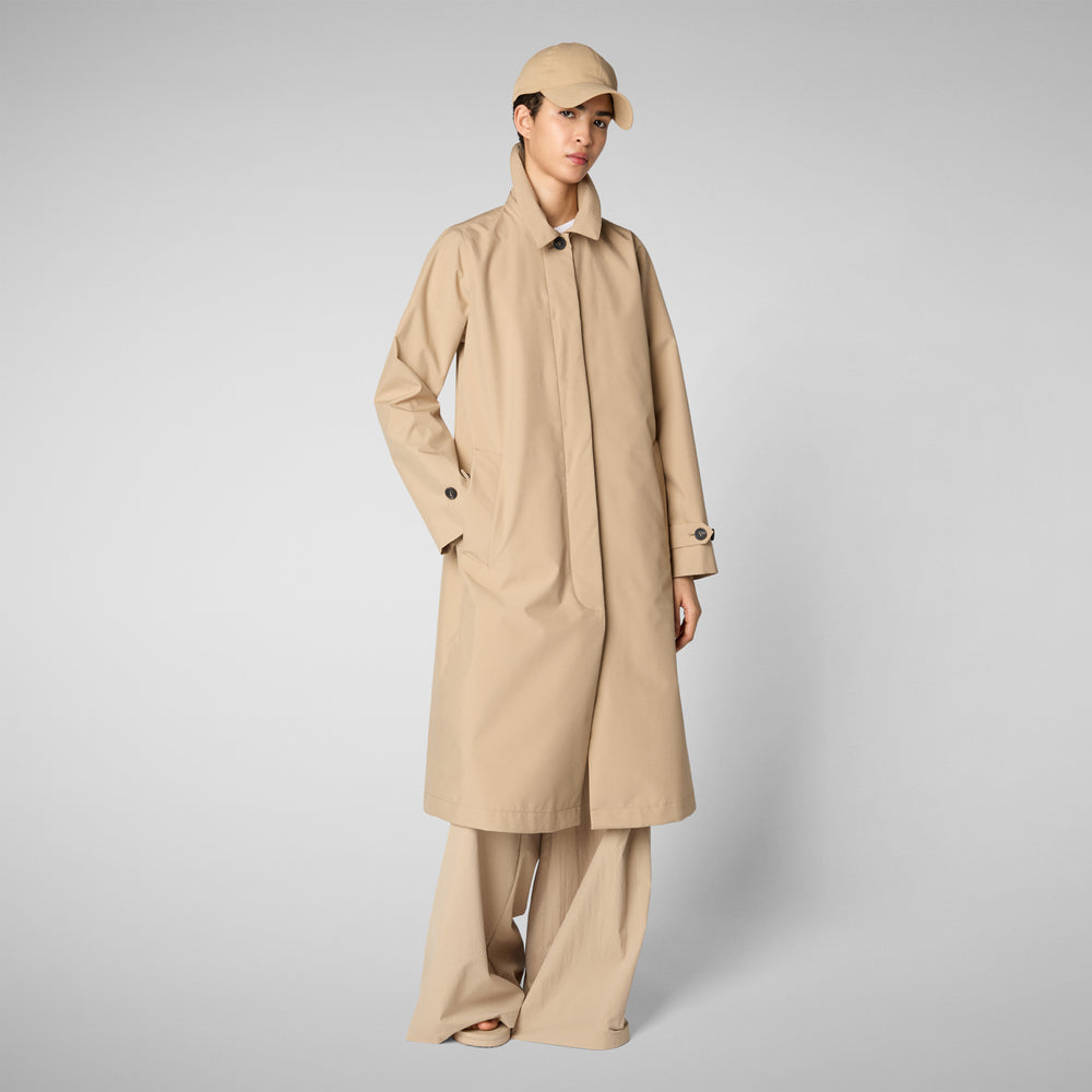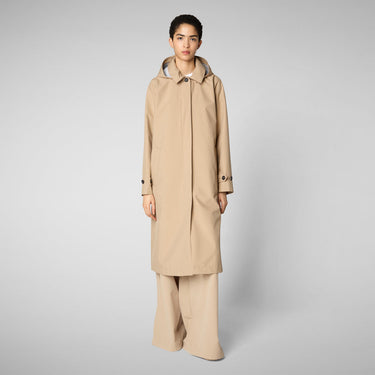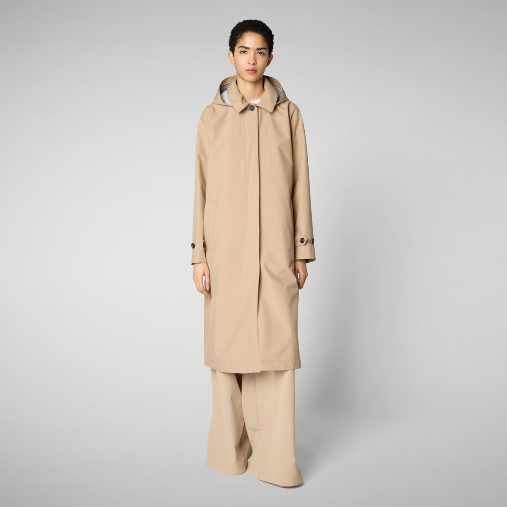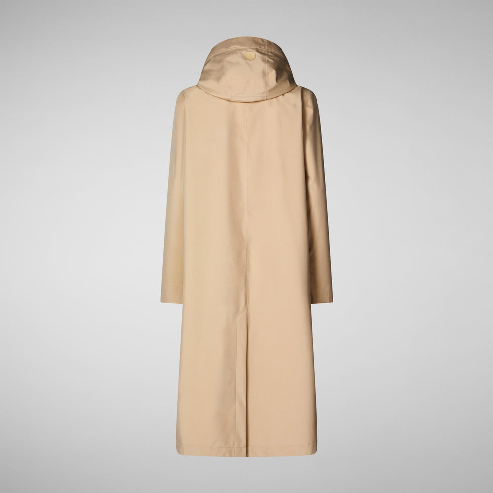 Shaped to a long silhouette, the Asia raincoat is made from recycled polyester fibers The design includes a detachable hood, buttoned tabs at the cuffs, side trench-inspired pockets and a hidden buttoned placket The customized black buttons and the logo glued on the back are signature elements of our animal-free style