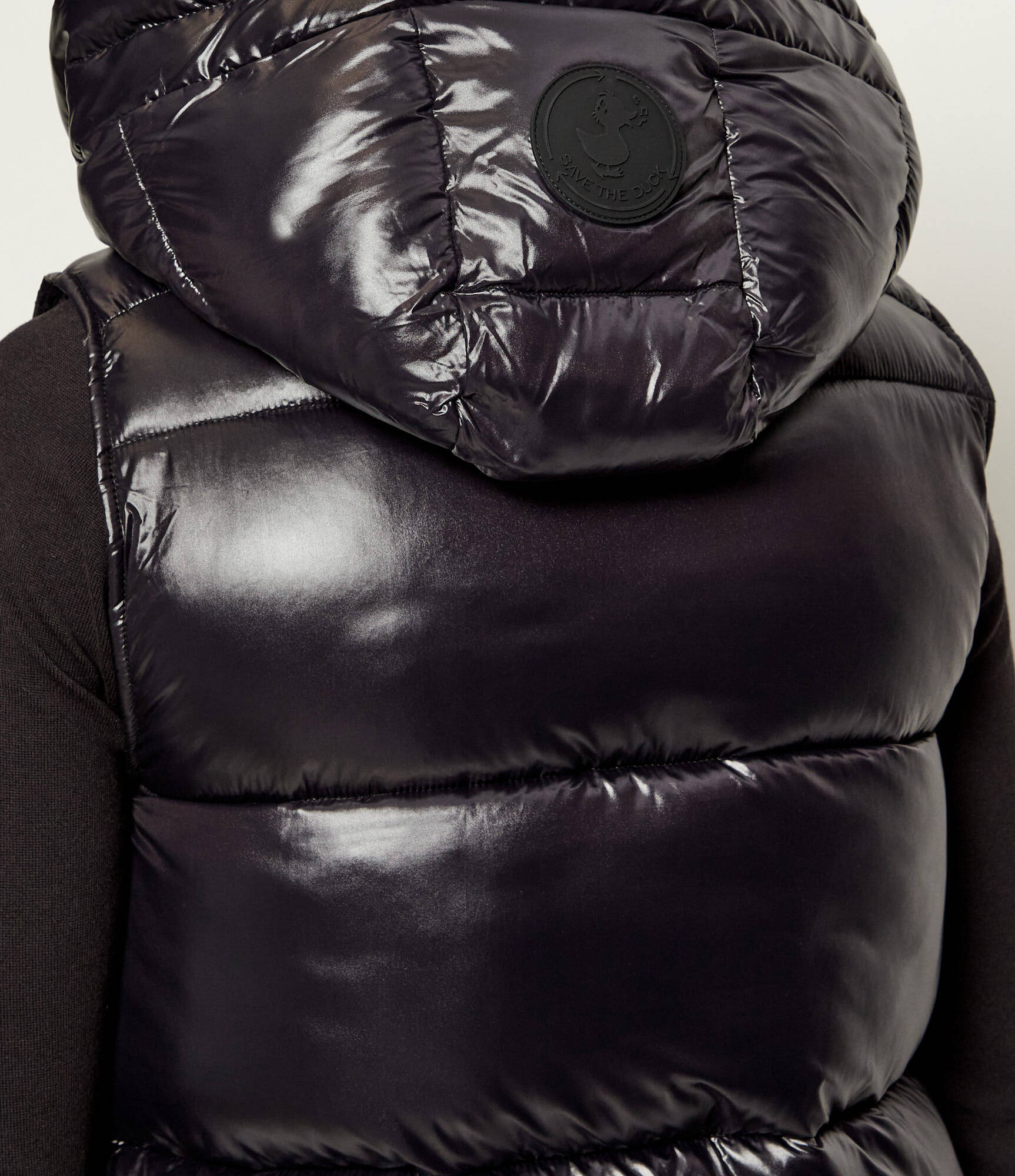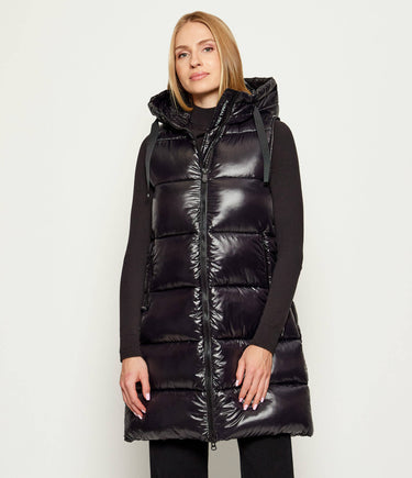 The IRIA Sleeveless Gilet from Save The Duck is a modern, eco-friendly essential for layering during the Fall/Winter 2025 season. Designed in sleek black with a regular fit, this long puffer-style gilet features a hood and horizontal quilted construction for warmth and comfort.