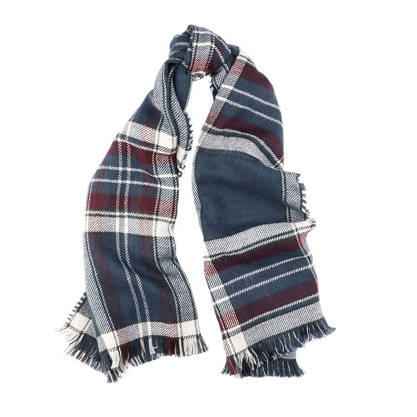 This double-sided blanket scarf features plaid to one side and a shepherd check to the other. Finished with a traditional fringed hem.