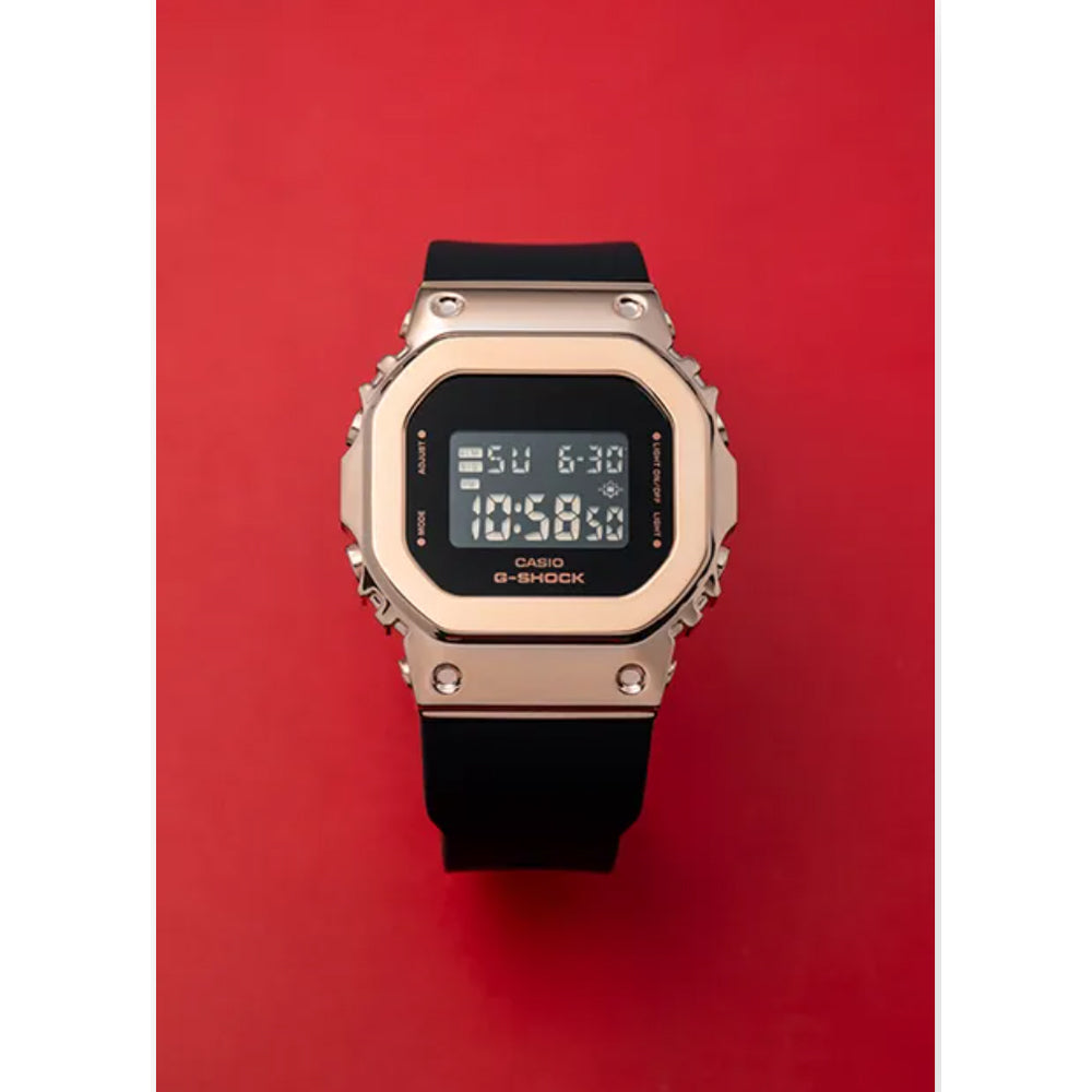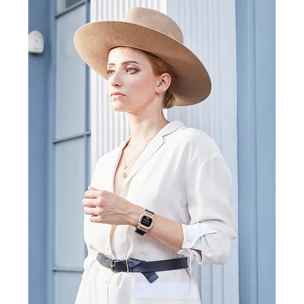 Introducing the new compact G-SHOCK models that are great choice for women who prefer the active G-SHOCK styling. This iconic square design of the 5600 Series is now equipped with a metal-covered bezel. All the shock resistance of the GM5600 in a smaller size for a lightweight and comfortable fit to the wrist. These designs blends elegance and casualness in ways that make them go great with street fashions. The case and bezel have mirror finishes that enhance the texture of the metal. This lineup provides a choice of four colors, including two pink gold models, a champagne gold model and, a silver model.