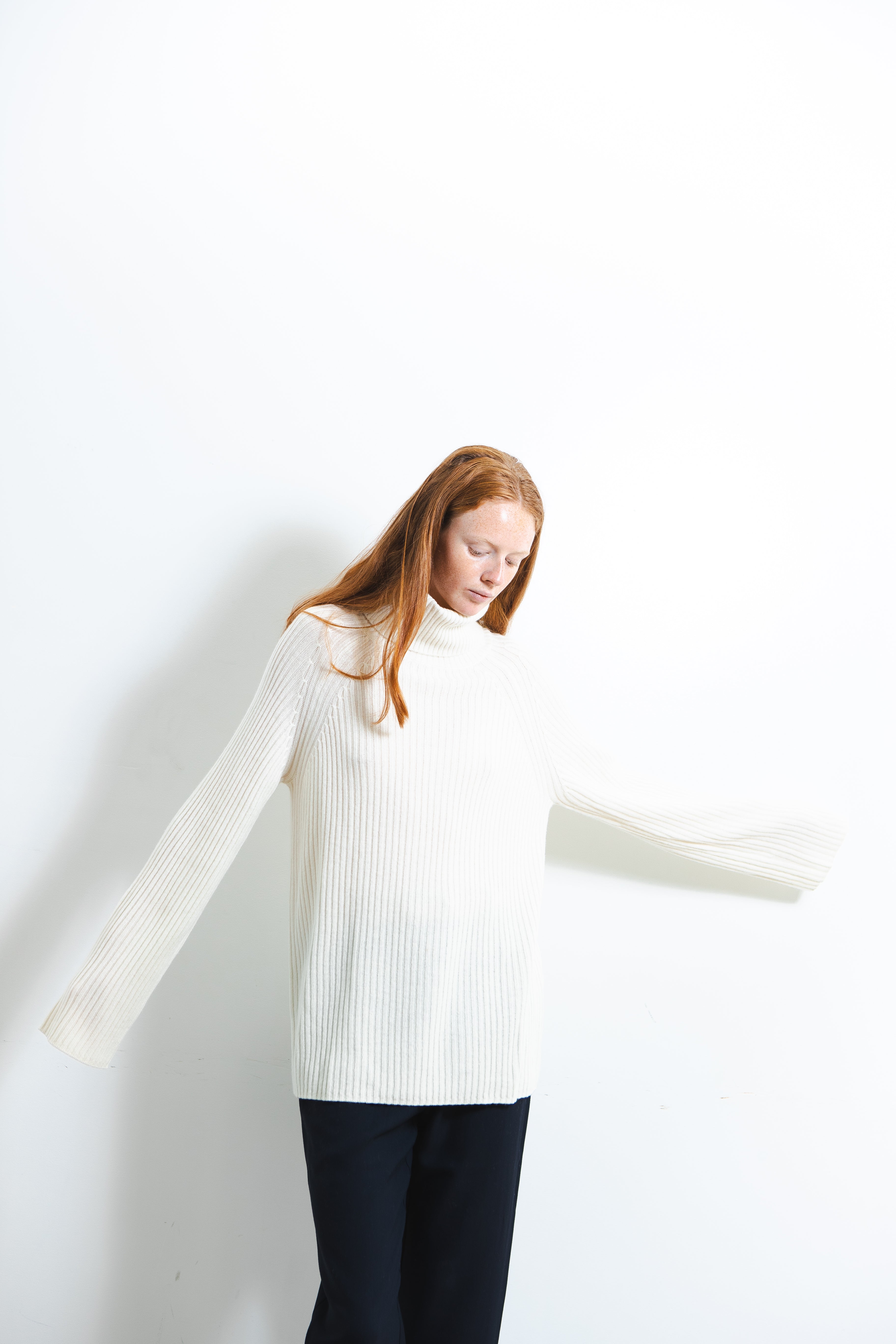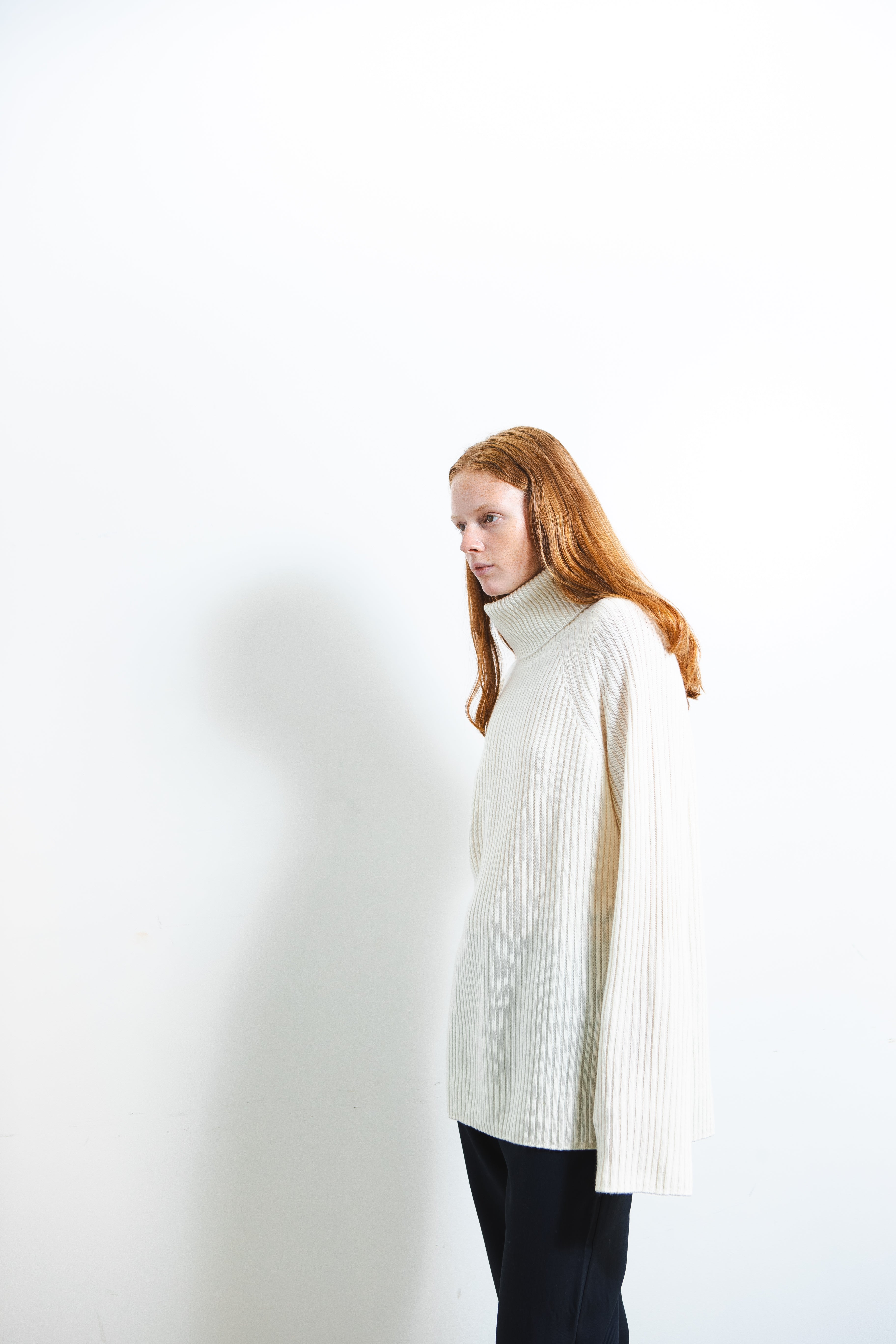 Knitted from a luxurious blend of 90% wool and 10% cashmere, this ribbed turtleneck sweater offers a perfect balance of warmth, softness, and structure. Designed in a relaxed, elongated silhouette, it drapes effortlessly for a modern, laid-back look ?€? versatile enough to be worn as a cozy sweater or styled as a sweater dress.